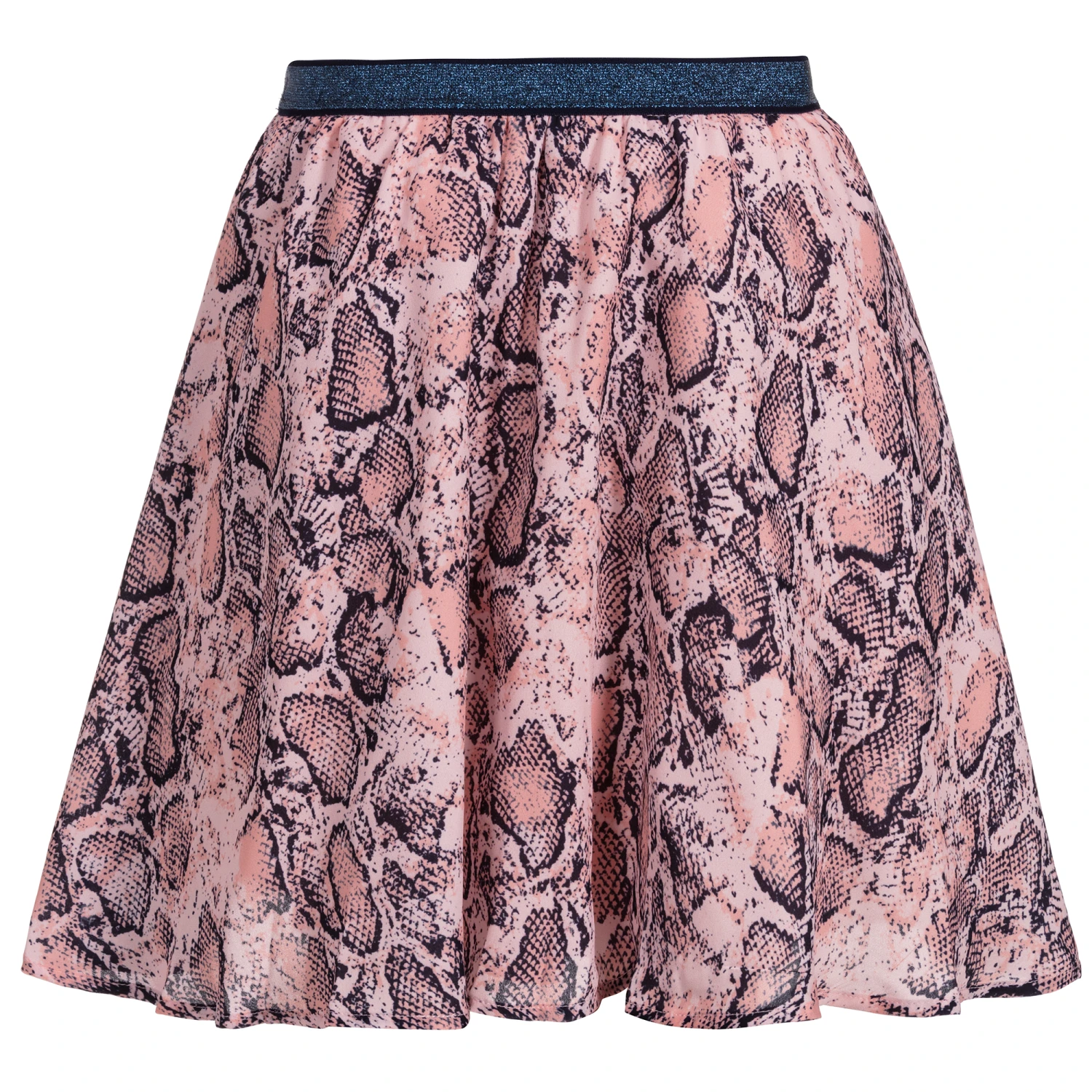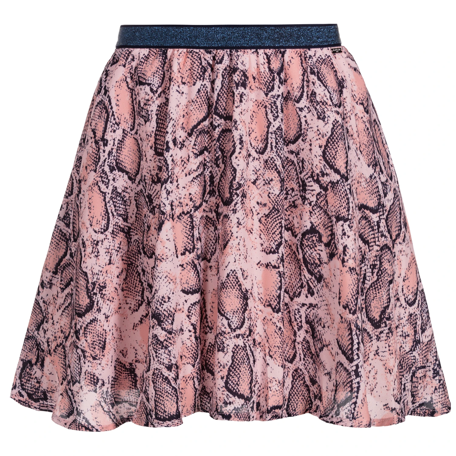 Girls soft pink chiffon skirt by Guess Marciano, with a black and pink snakeskin pattern. It has net underlayers for added volume and a stretchy jersey lining for comfort. The waistband has a blue sparkly finish and is lightly elasticated for a good fit.