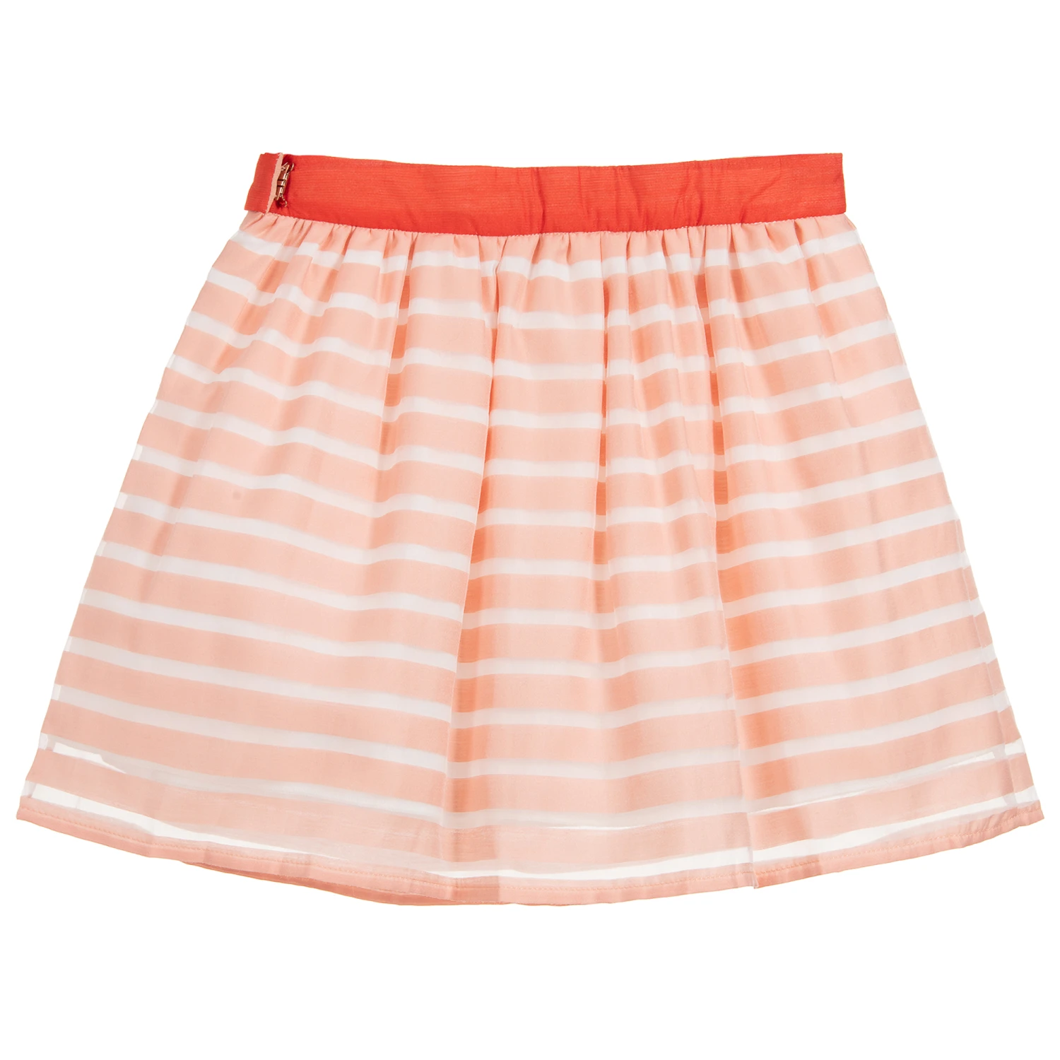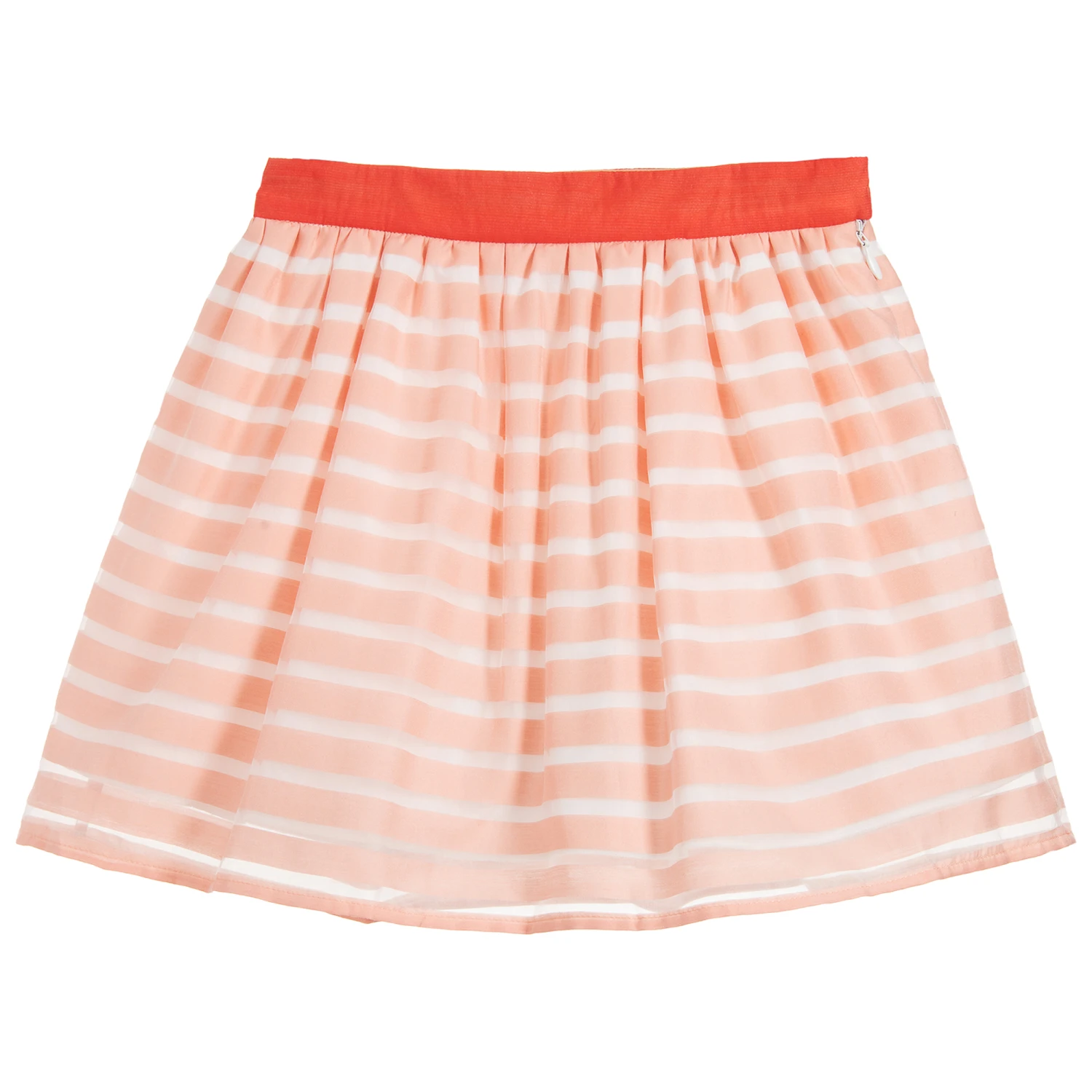 An adorable pink chiffon skirt by Hucklebones London, with white satin contrast that shows through the stripes. It has an orange waistband, with a side zip fastening.