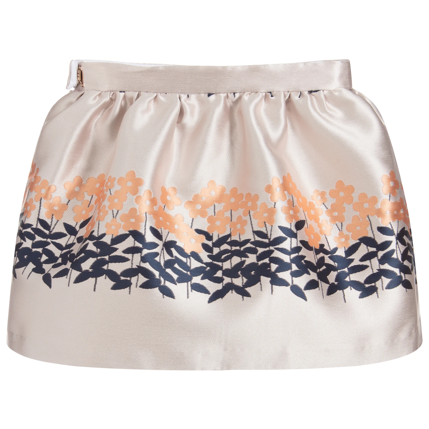 Pink jacquard skirt for girls by Hucklebones London, with an orange and navy blue floral pattern.