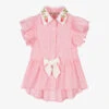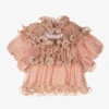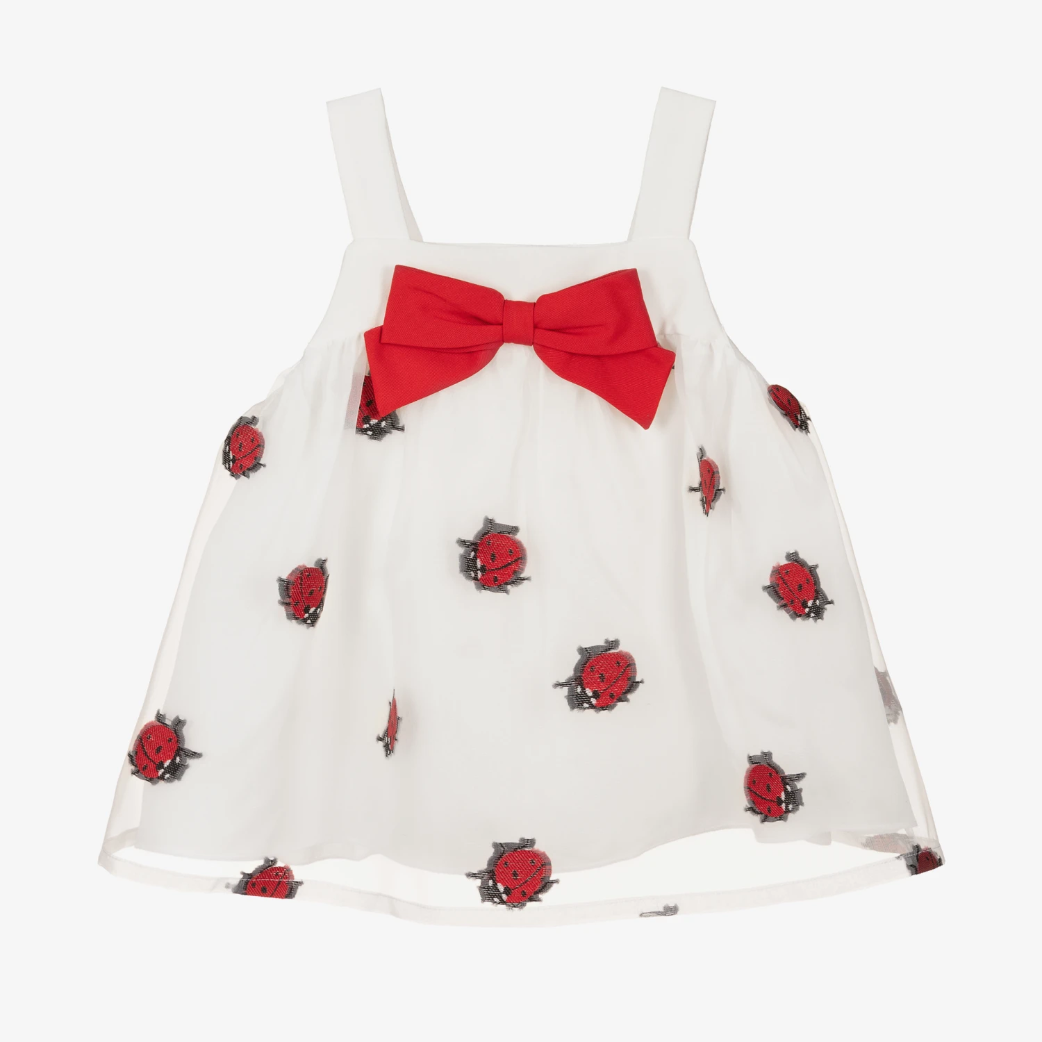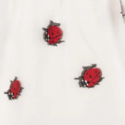 Gorgeous white organza blouse for girls by Hucklebones London. In a puffed style, it has cute red ladybirds embroidered all-over and a twill bow on the front. Fastening on the back with two gold buttons, it has a silky underlayer and a soft voile lining for comfort on the skin.