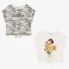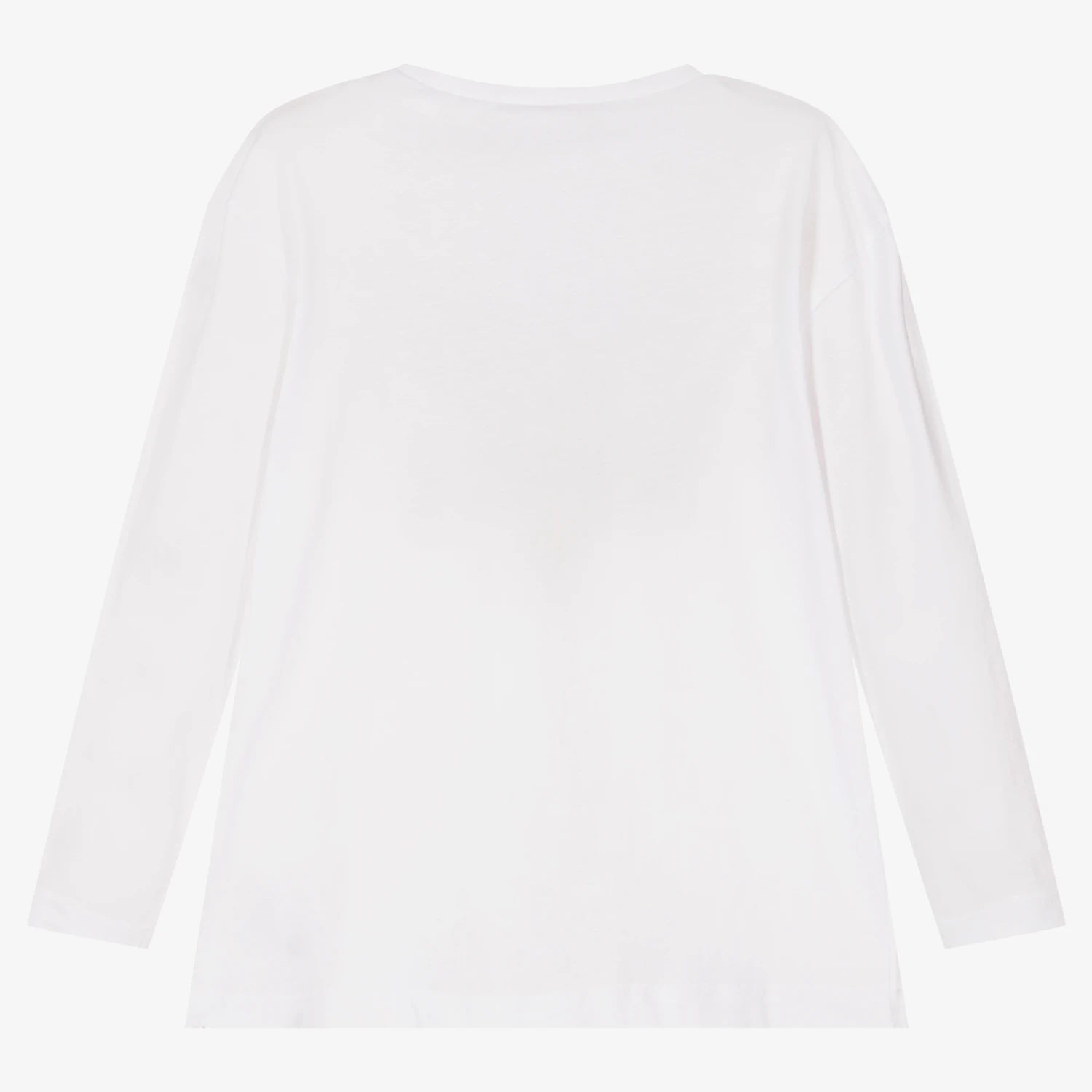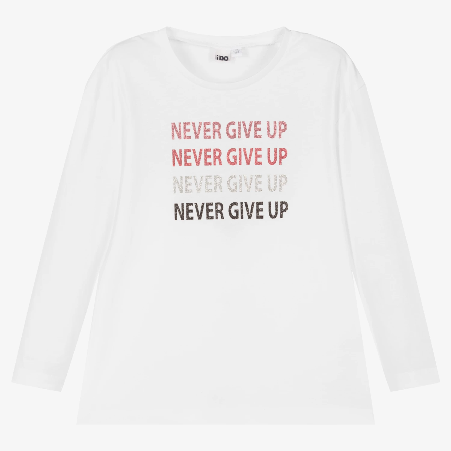 White top for girls by iDO Junior, made in soft cotton jersey. The front is printed with ‘Never Give Up’, repeated in glittery red, silver and black letters.