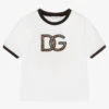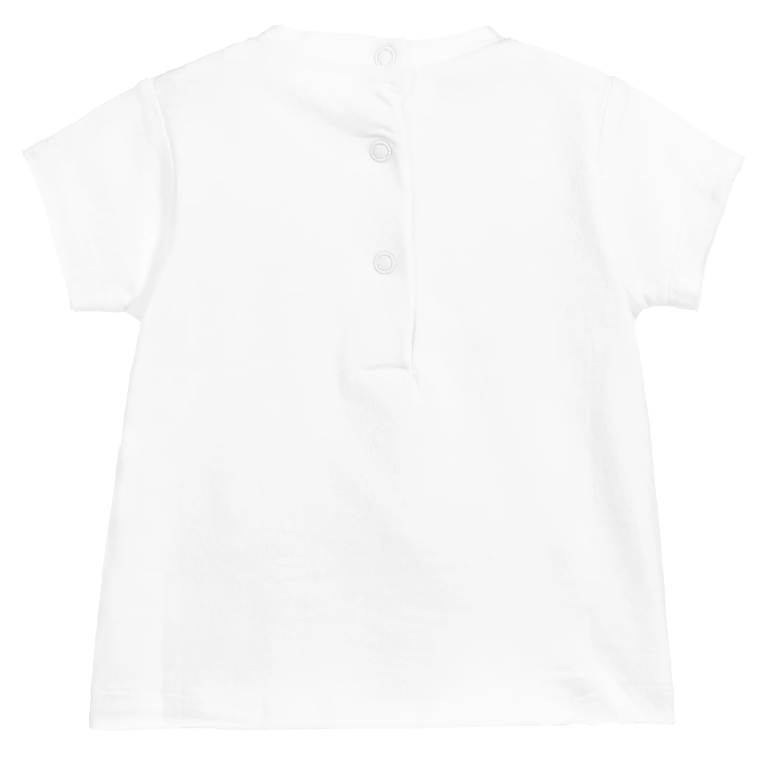 Girls white T-shirt by iDO Mini, made in soft cotton jersey. It has a white appliqué logo with a diamanté heart on the front.