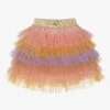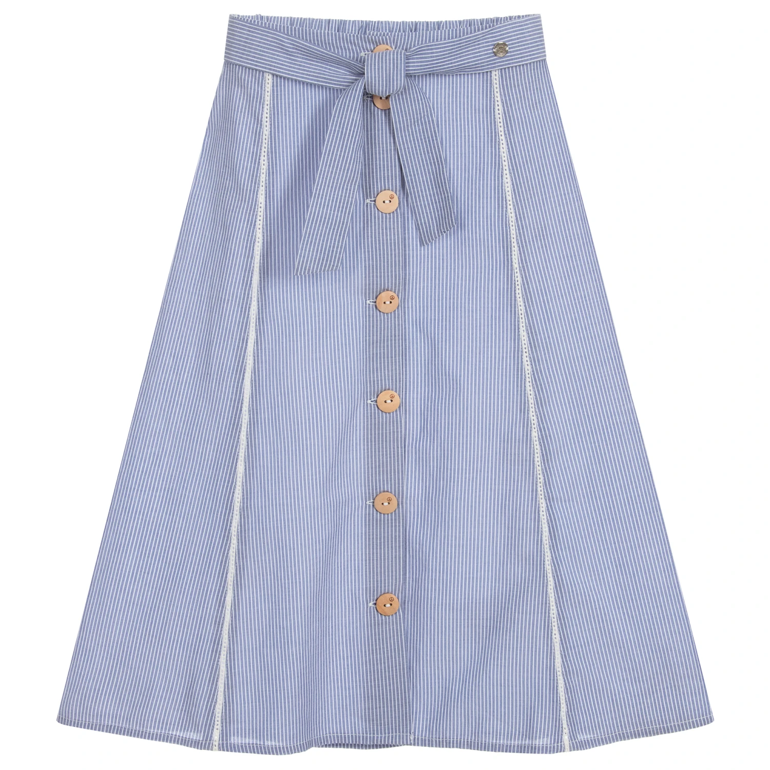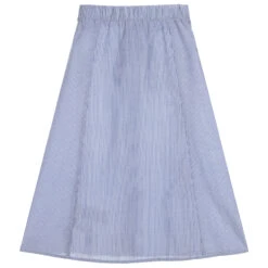 Blue and white striped skirt for girls by IKKS. Made in a soft, lightweight cotton and polyester blend, the waistband is elasticated around the back and has an attached sash tie on the front. It has beige wooden buttons and white cut work down the front.