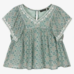 Mint blue blouse for girls from IKKS, made and lined in super-soft modal. The fabric is enhanced by a lovely tile pattern in blue and pale pink, and detailed with gorgeous white embroidery. It has an easy-to-fasten keyhole button on the back, relaxed-fit shape and sweet capped sleeves.