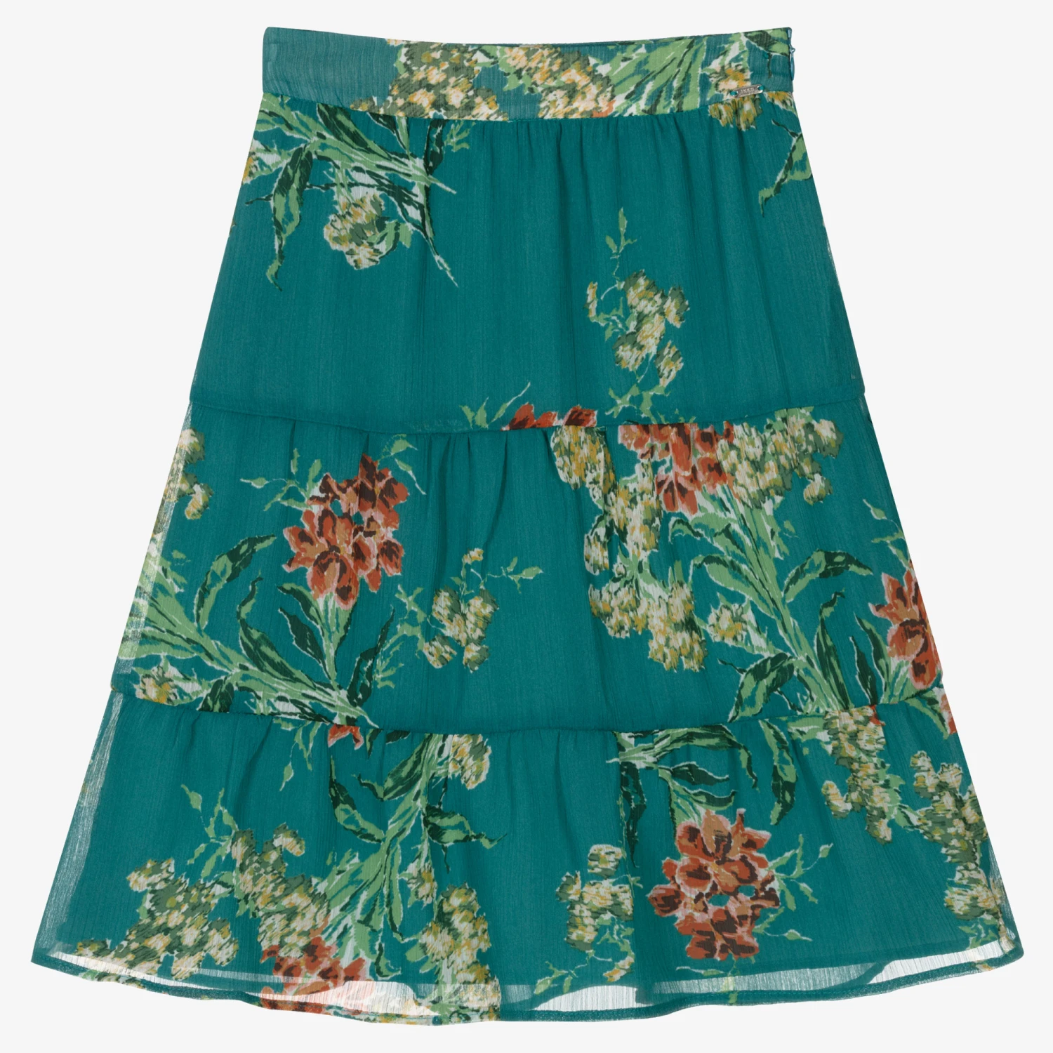 A gorgeous green skirt for girls by French brand IKKS, patterned in a floral eucalyptus design with a silver charm logo on the front. This flowy tiered skirt falls delicately to the ankle for coverage, and has an adjustable waistband and a side zip fastening for easy dressing.