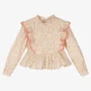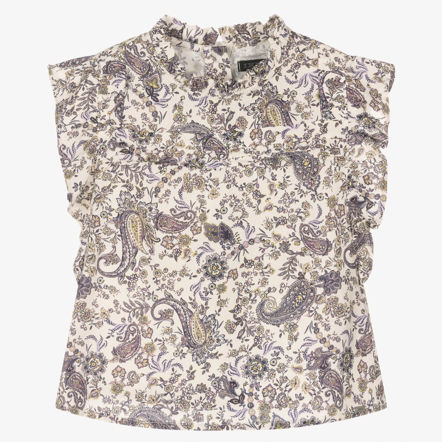 Elegant ivory blouse for girls by IKKS. Soft and lightweight, the fabric is decorated with a lovely paisley print in complementary purple and khaki green. This pretty top has short ruffle sleeves, pin tuck details on the front and a frilled neckline. It fastens easily with a neat hidden zip on the back.