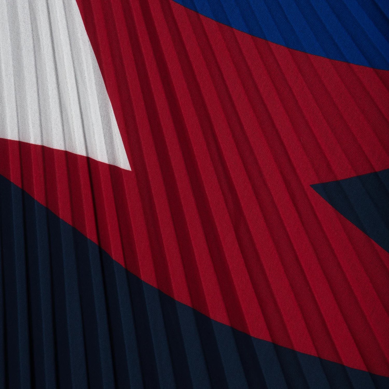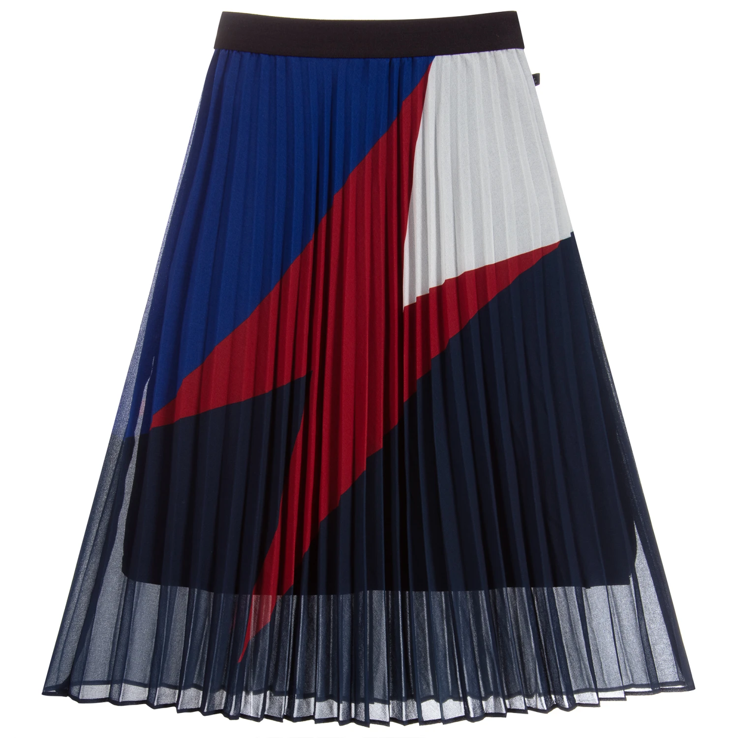 Long, pleated skirt for girls by IKKS. Made in silky polyester chiffon with a lightweight lining, it has a red lightning strike pattern with a blue, navy blue and white background. The comfortable black waistband is elasticated.