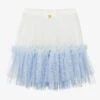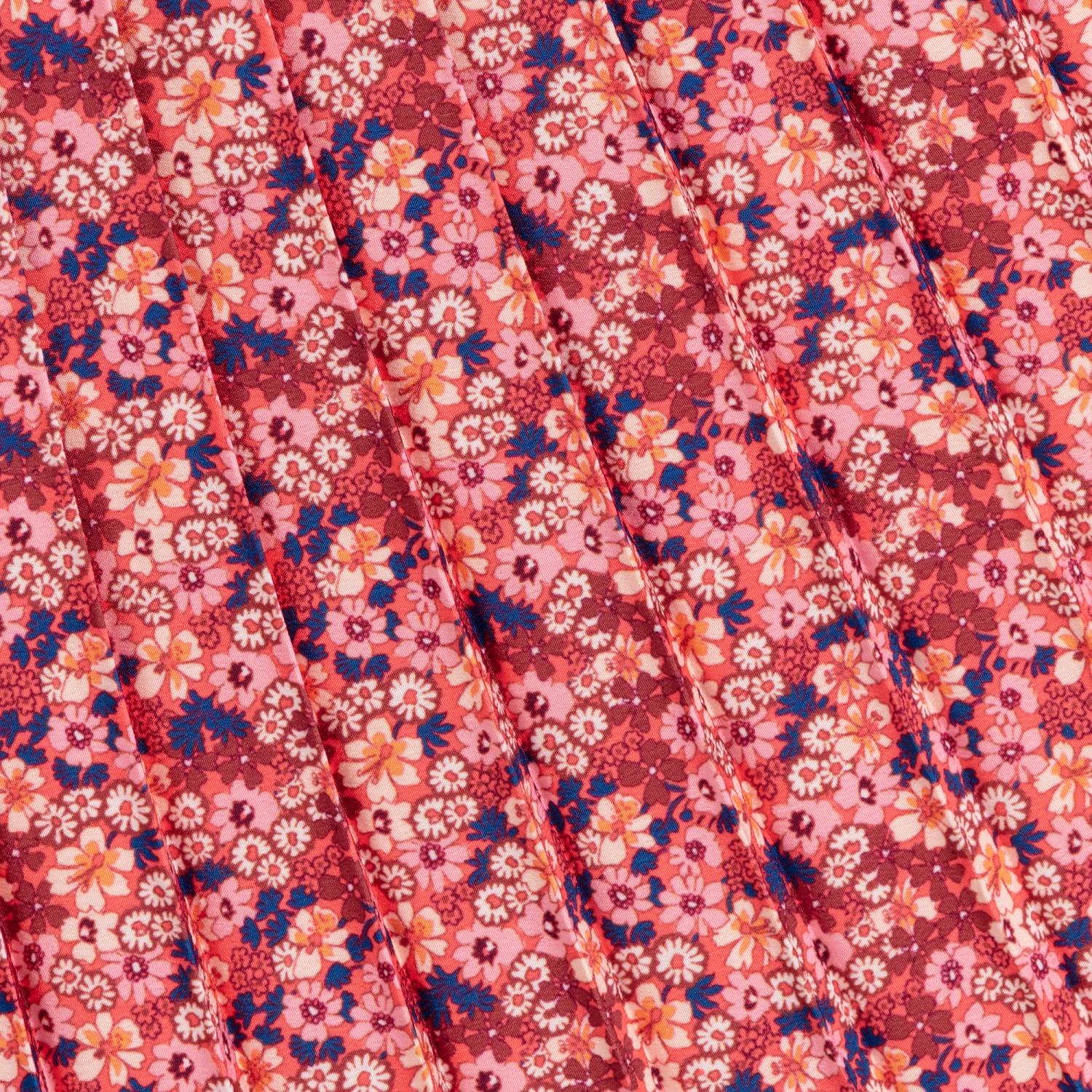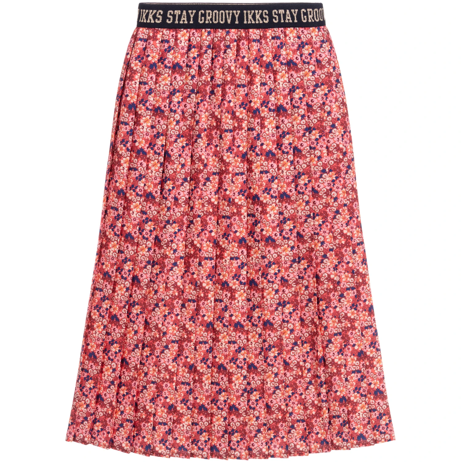 Pink and navy blue floral skirt for girls by IKKS. Made in soft, lightweight, pleated polyester, it has a comfortable, elasticated waistband in black with a repeat glittery gold logo and the words ‘stay groovy’.