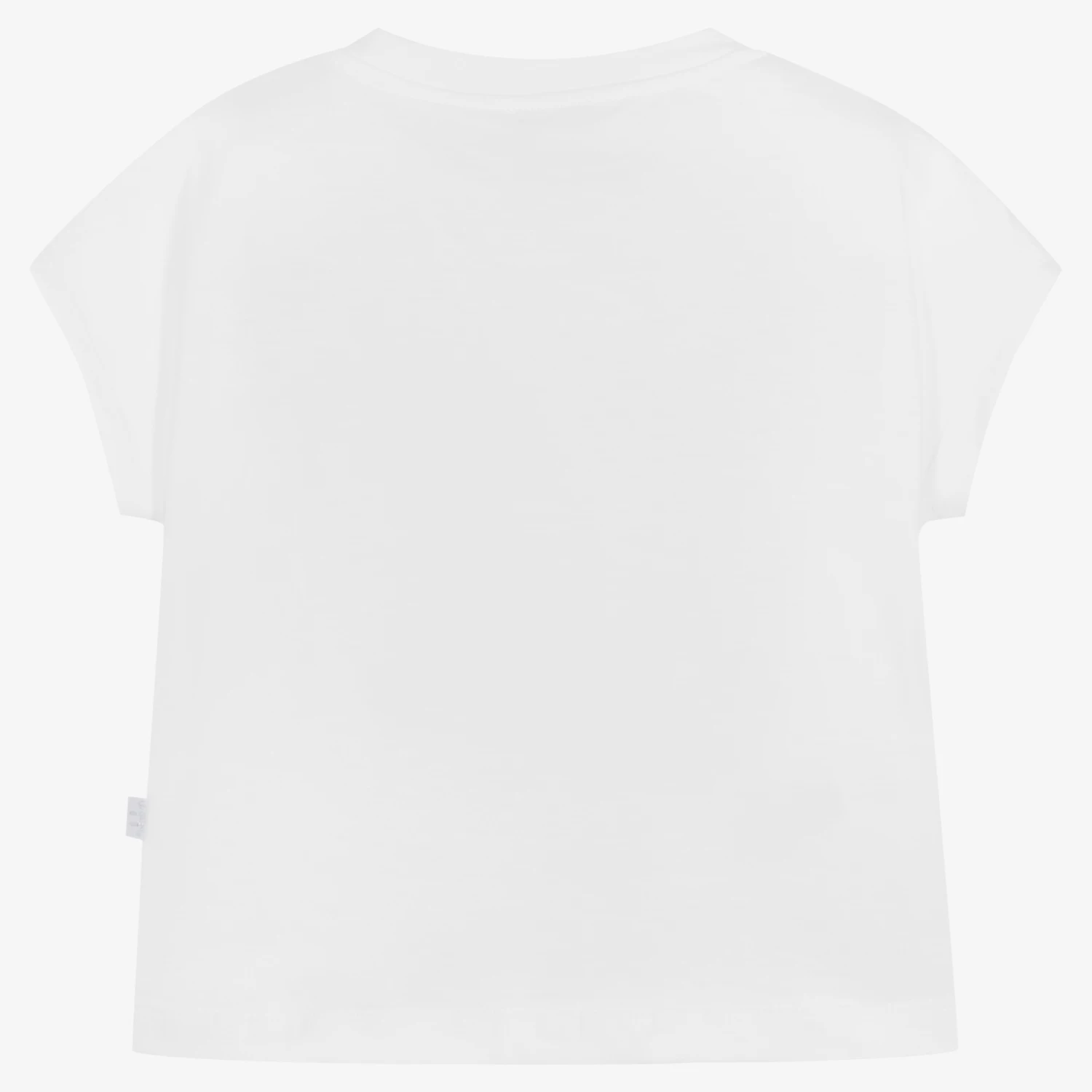 Lovely white cotton T-shirt for girls by luxury Italian brand Il Gufo, with a dreamy beach hut and bike print including appliqué flowers. Loose-fitting with seamless sleeves, it is ideal for relaxed days.