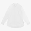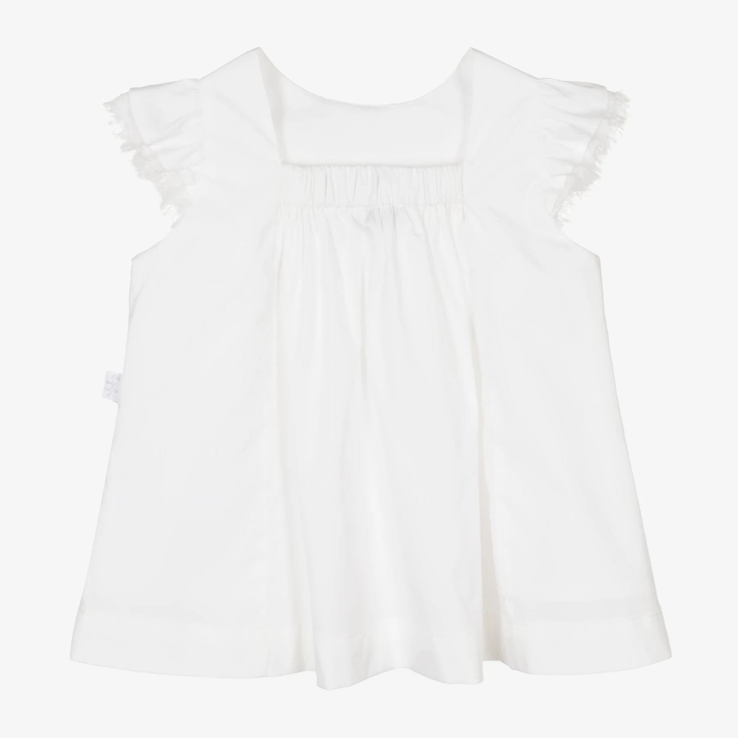Girls white cotton poplin blouse from luxury designer Il Gufo. This lovely top is characterised by layered poplin and voile capped sleeves, with stitch details and raw, unfinished edges for a pretty vintage effect. The Italian label’s logo tab is stitched on the side seam for a subtle designer look. Soft and lightweight, it has an elasticated panel and pleat detail on the back for quick and easy dressing.