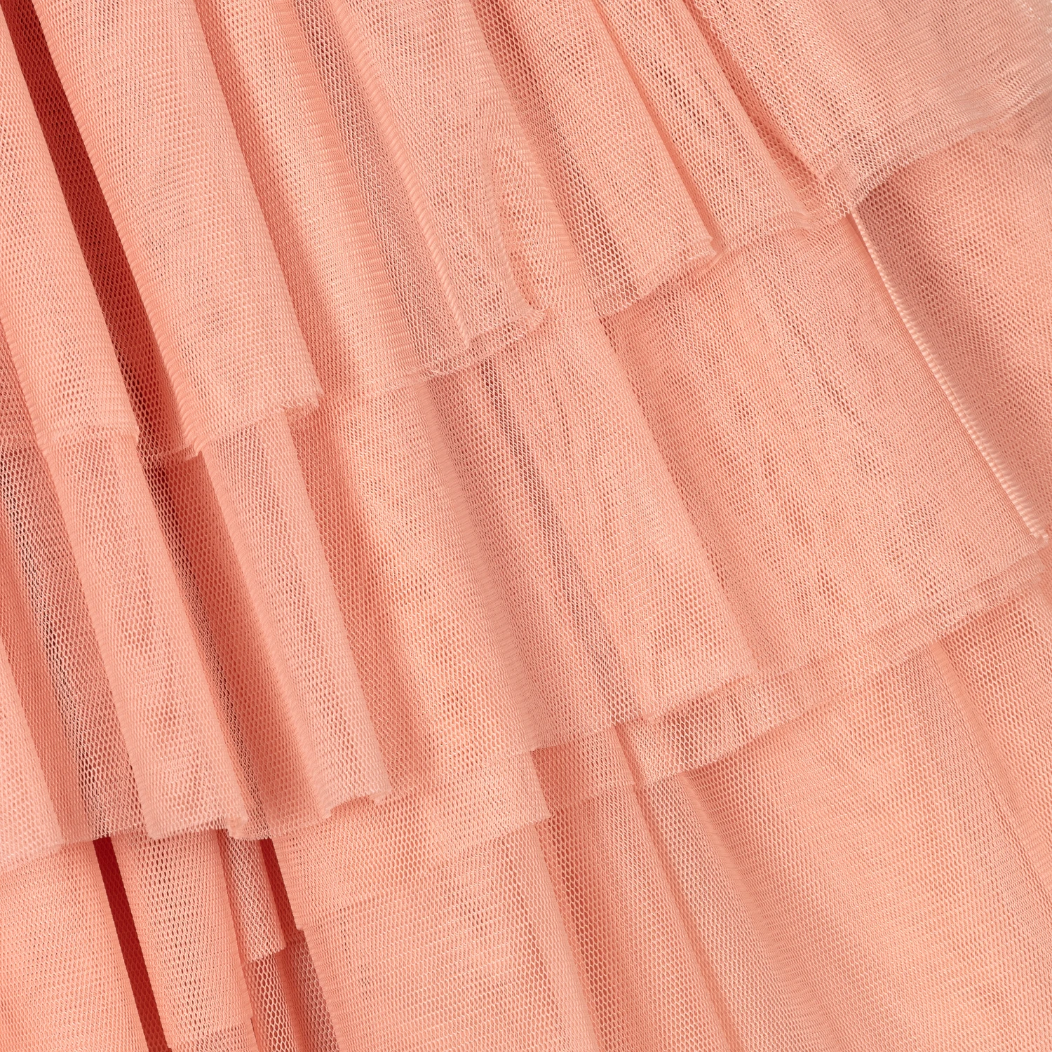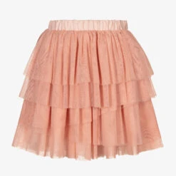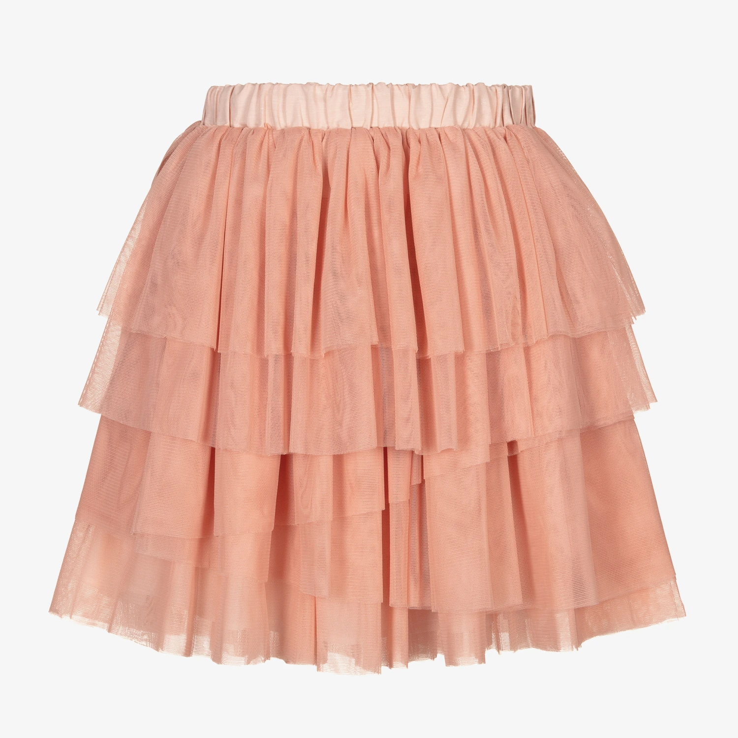 Girls pink tulle skirt by Jessie and James London. Made from six layers of gathered tulle, the shape is full and floaty and midi in length. The elasticated cotton blend waistband is soft and stretchy. The skirt is fully lined in cotton voile for comfort and has a logo tag stitched at the side.
