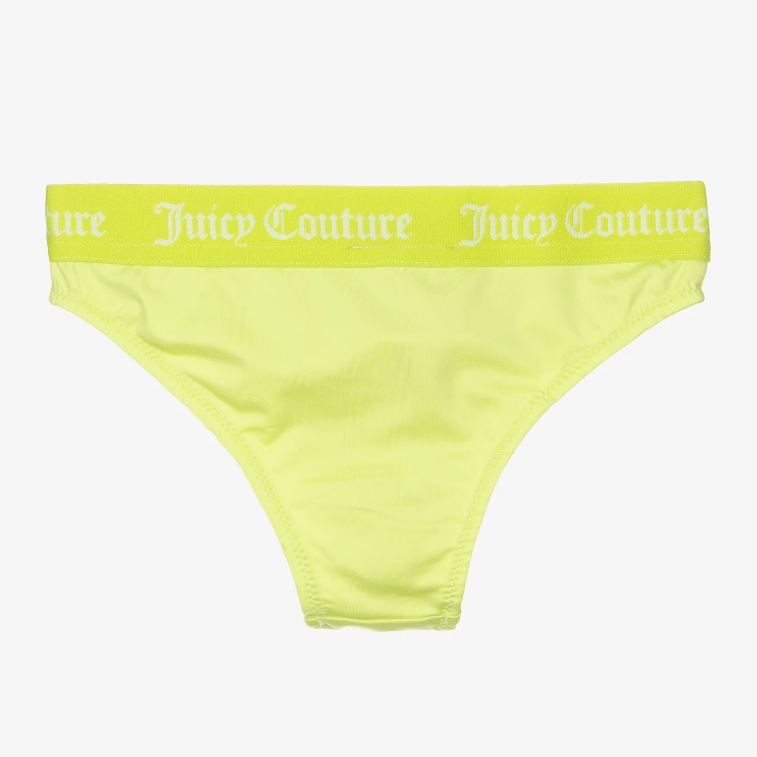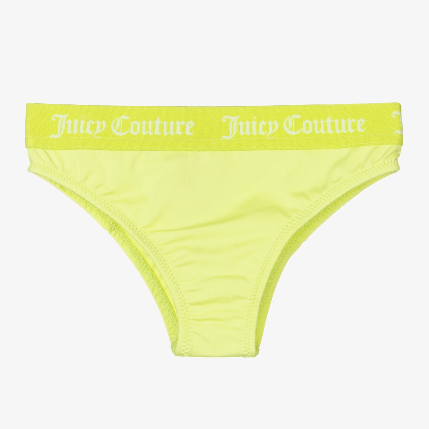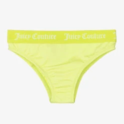 Lime green bikini bottoms for girls by Juicy Couture. Silky smooth and stretchy, they are lined at the front and have an elasticated waistband with white repeat logos.