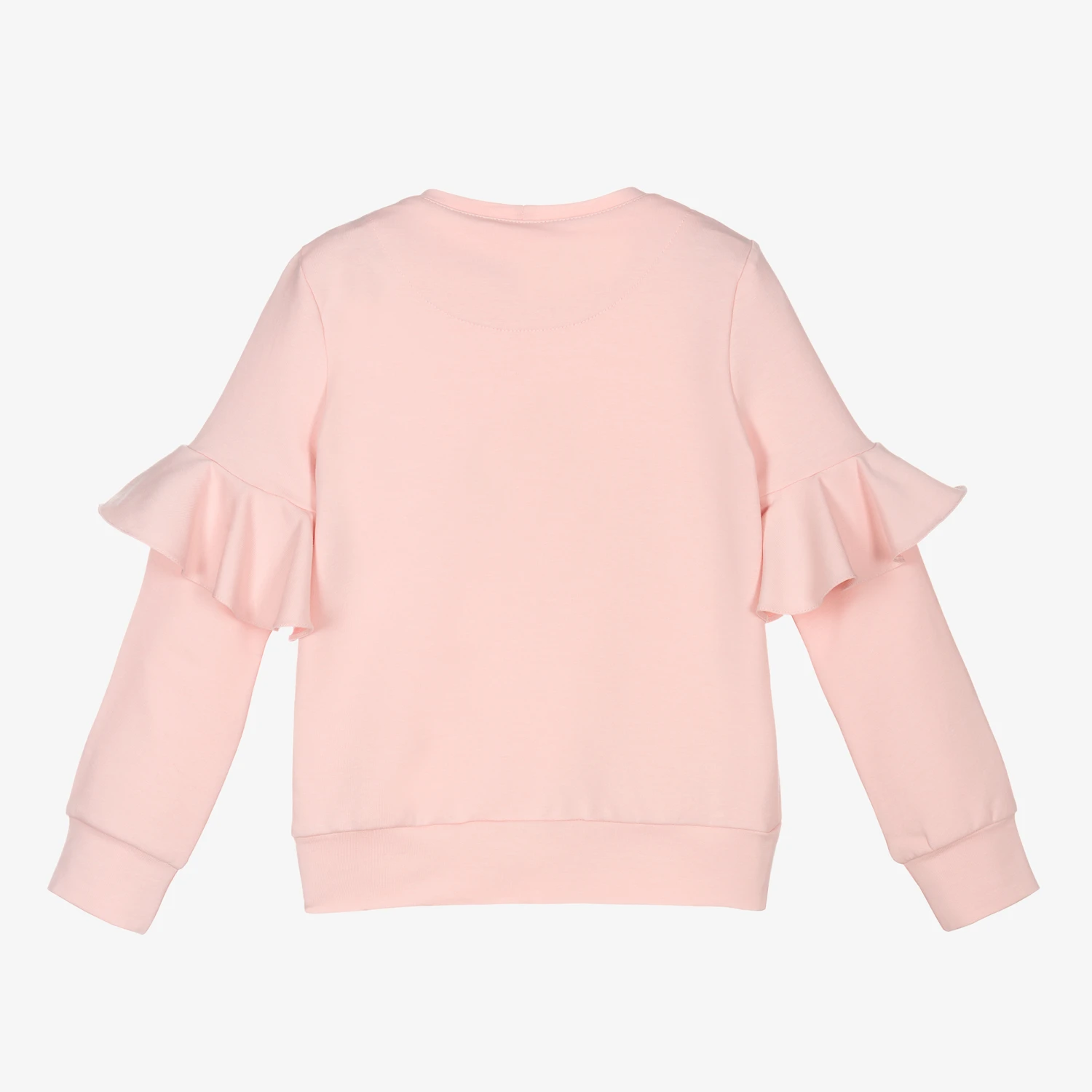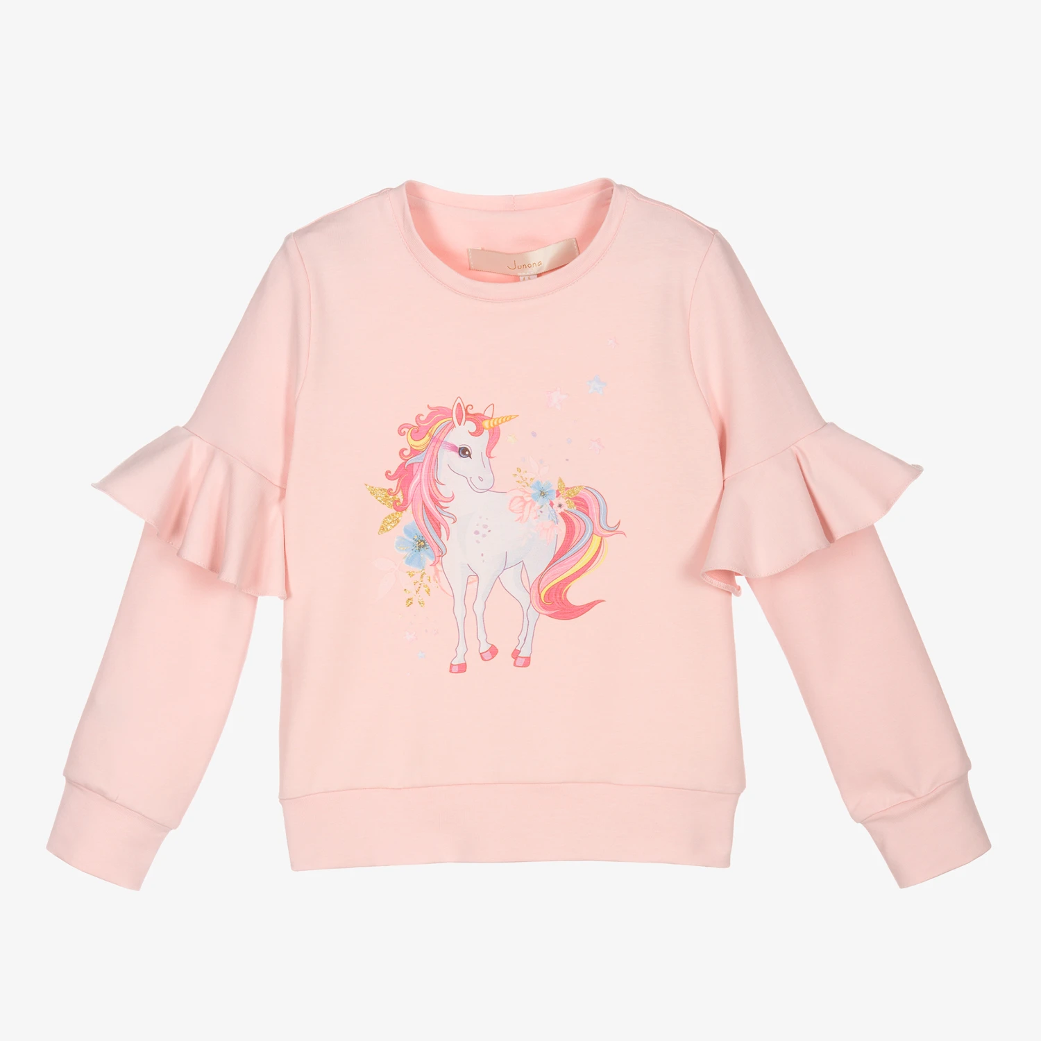 Pretty pink top for girls by Junona, with a cute and colourful unicorn print. It is made in soft and stretchy cotton jersey with ruffle detail on the sleeves.