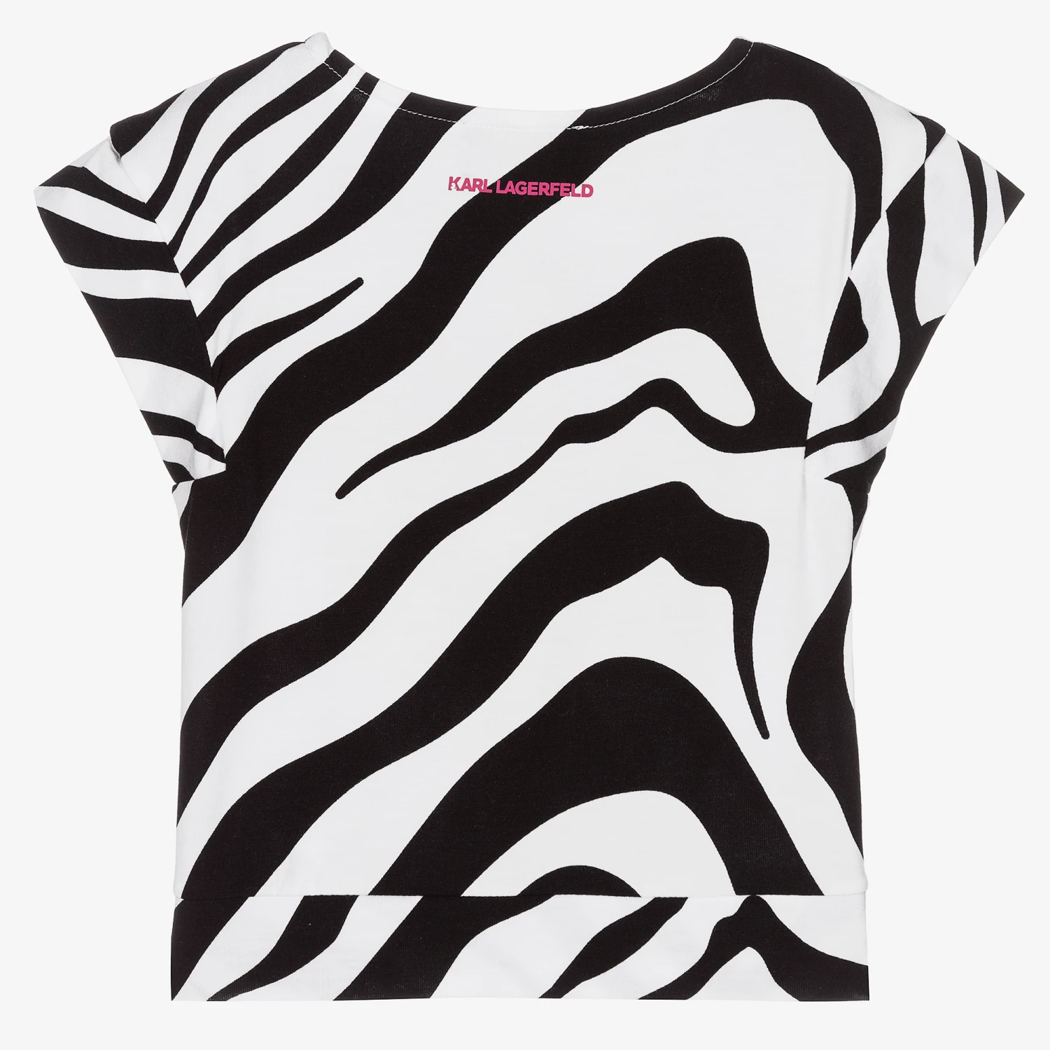 Black and white zebra print T-shirt for girls by KARL LAGERFELD KIDS. Made in a super soft cotton and modal blend, it has the brand’s shiny pink rubberised logo on the front and cute capped sleeves.
