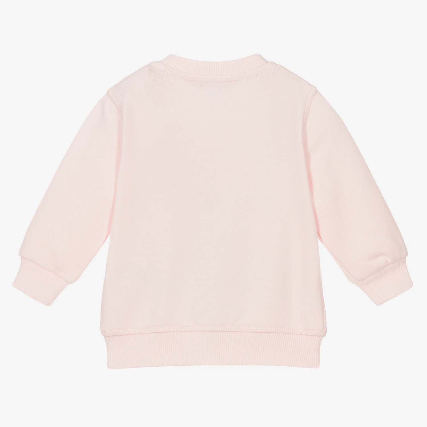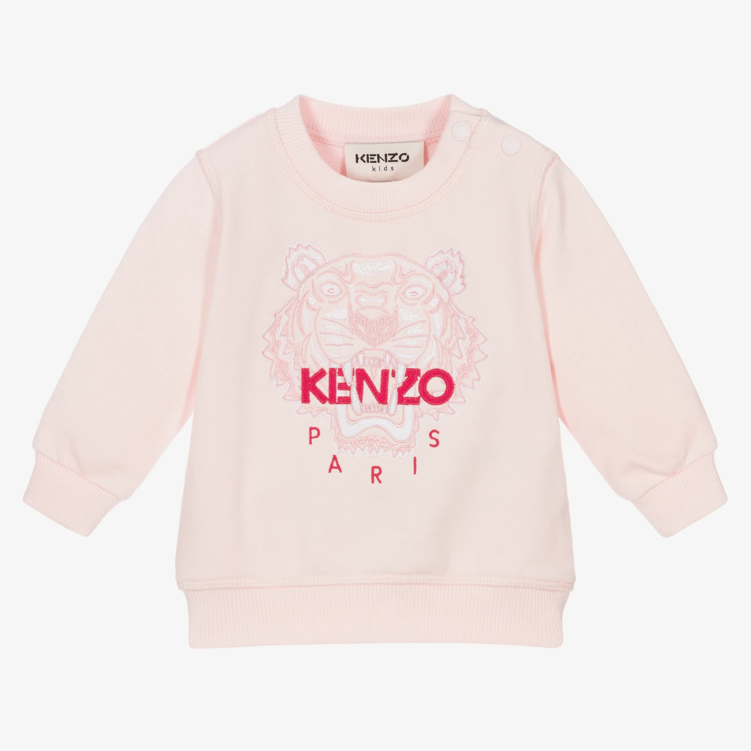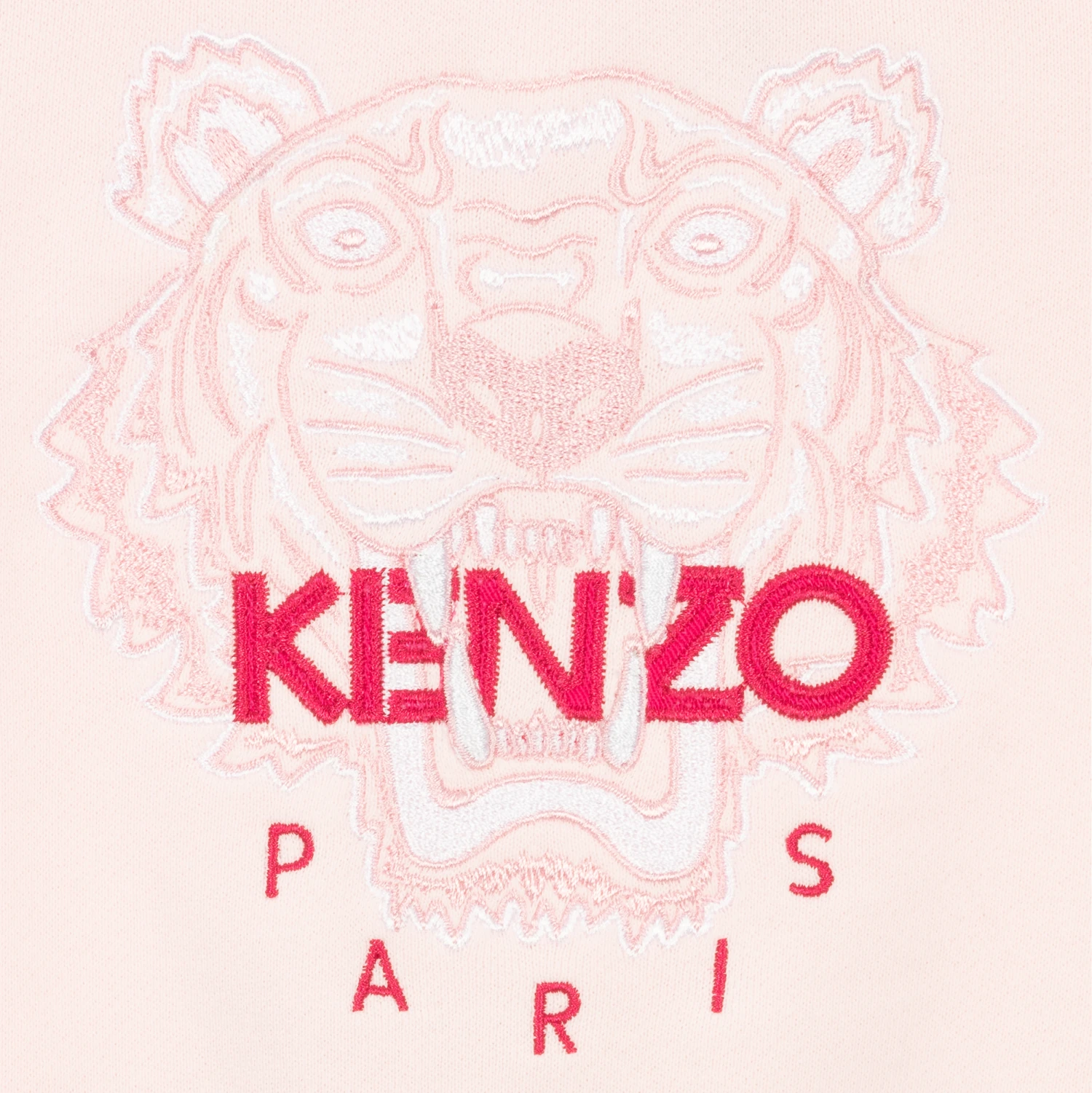 Pale pink sweatshirt for little girls by KENZO KIDS, made in soft cotton jersey. It has the brand’s iconic Tiger logo embroidered in shades of pink and white on the front.