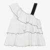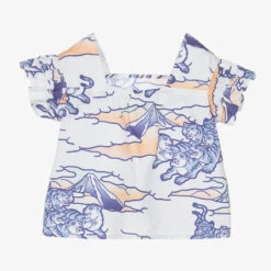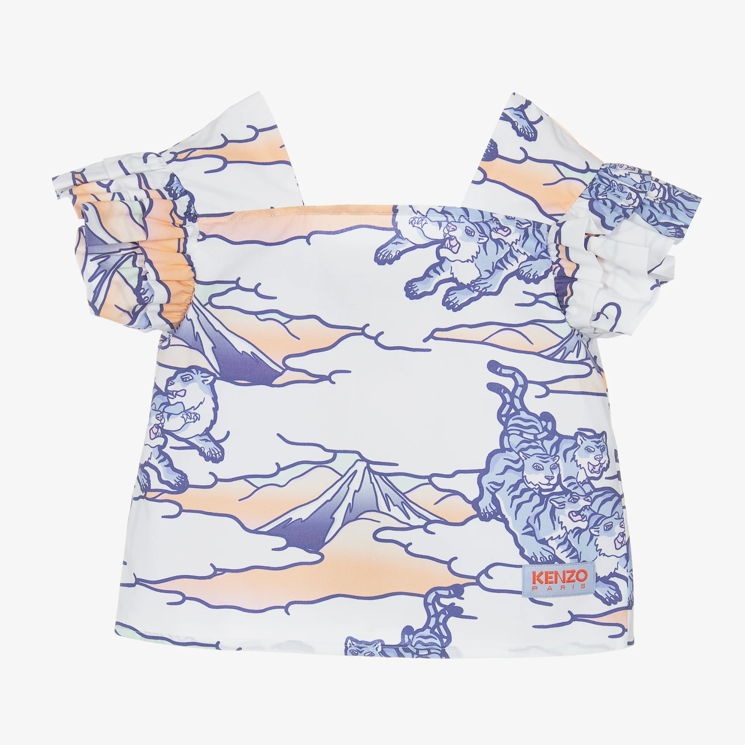 White patterned blouse for girls by KENZO KIDS, made in soft cotton poplin. It is printed in an all-over rainbow print featuring eye-catching, indigo-blue tigers, Mount Fuji and large white clouds. Lightweight with layered ruffled sleeves, it has a square cut, elasticated neckline for a modern look and a woven logo label stitched above the hemline.