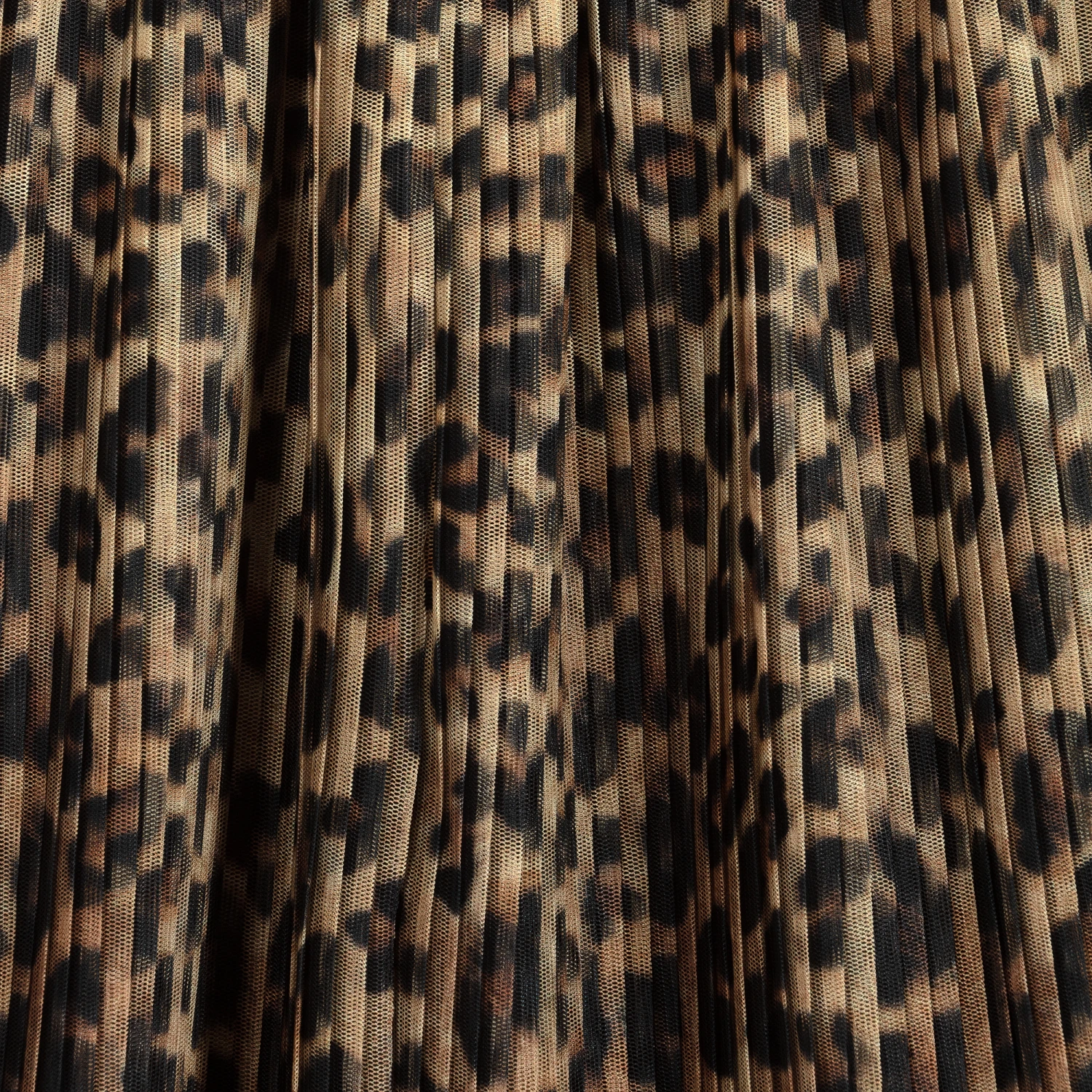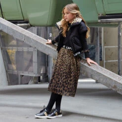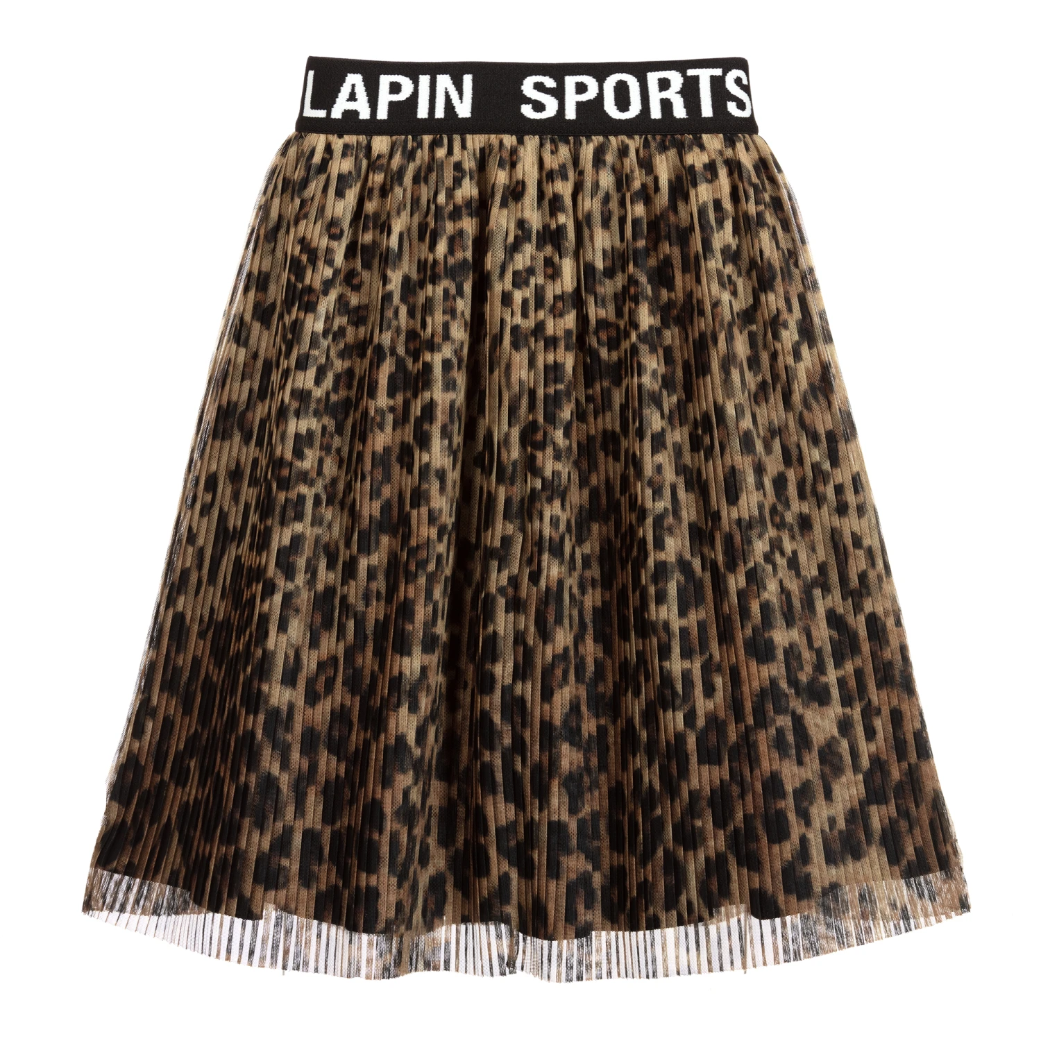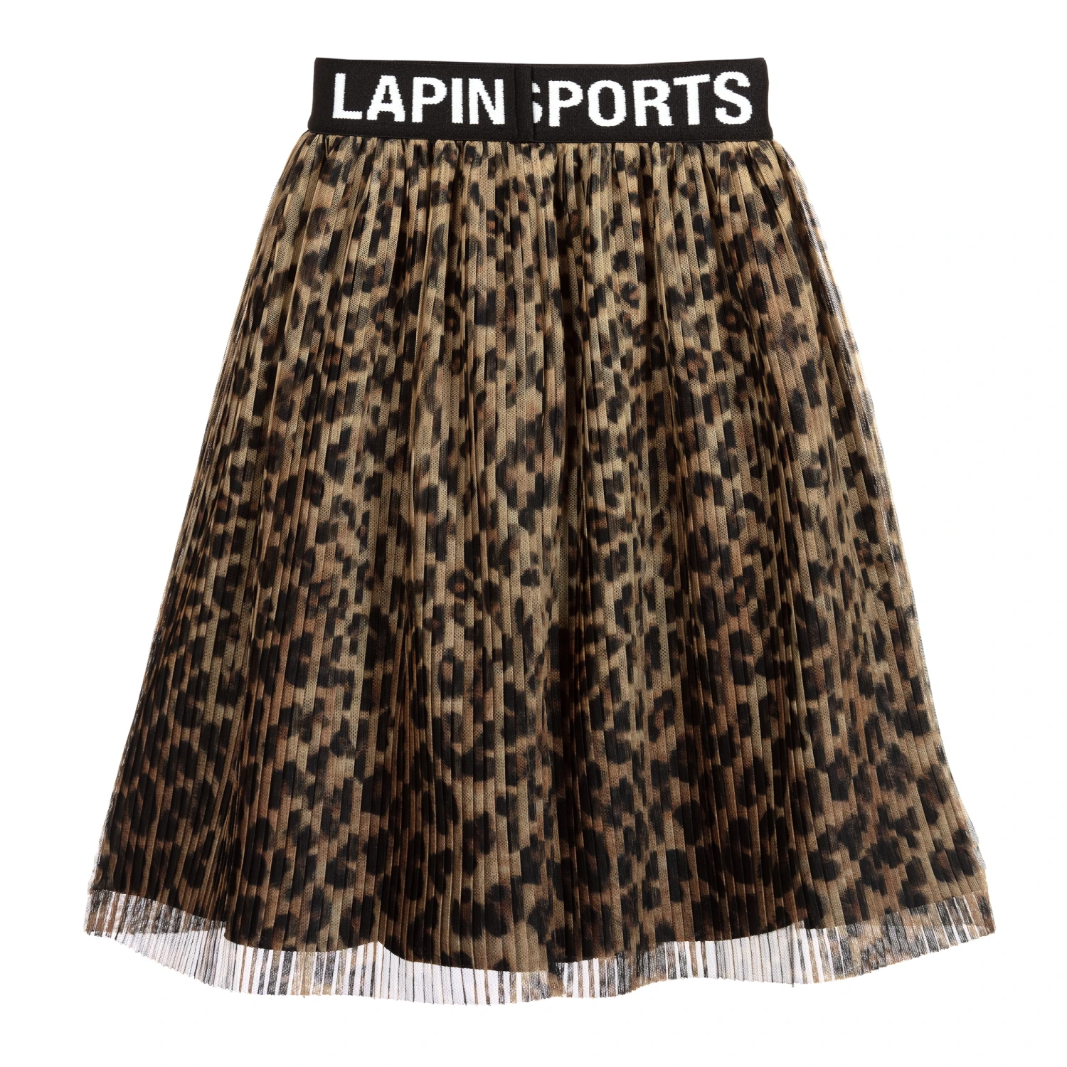 Long tulle skirt for girls by Lapin House, patterned with a brown and black animal print. The skirt has a soft, mid-weight black lining and an elasticated black waistband with white ‘Lapin Sports’ branding.