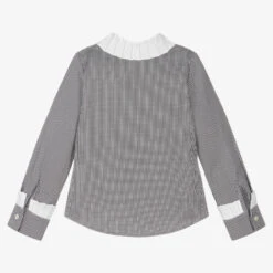 Black and white check blouse for girls by Lapin House, with sweet white pleated trims and collar. Made in soft and lightweight cotton poplin, there are button fastenings concealed under the front placket and on the cuffs.