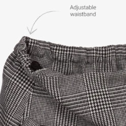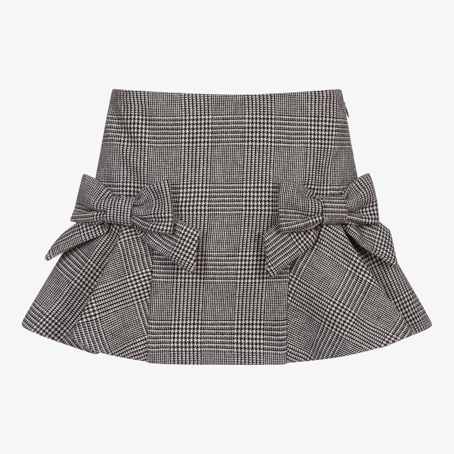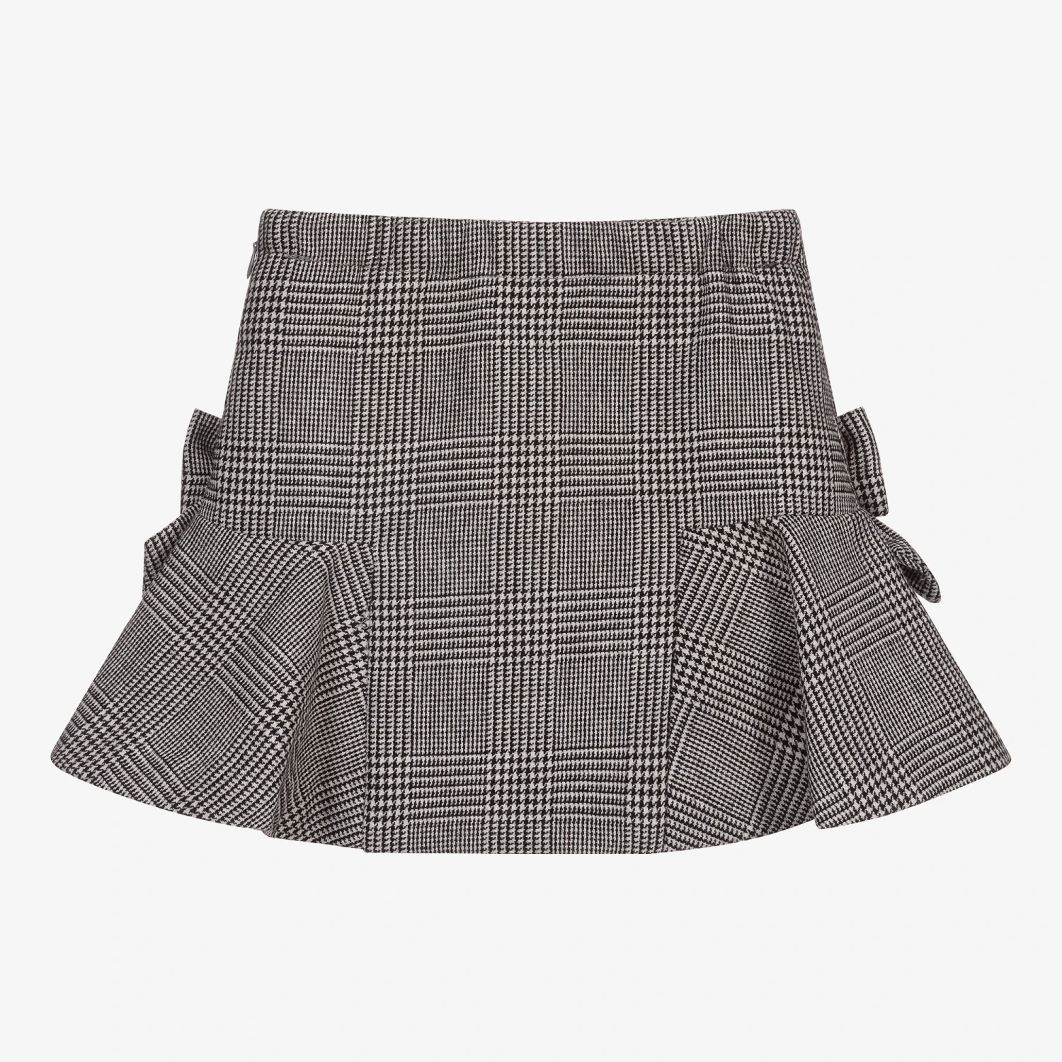 Girls black and white houndstooth check skirt by Lapin House. Made in a soft wool blend, this warm and mid-weight design has bows and pleats at the sides. It has a side zip and an adjustable, elasticated waist and it is fully lined for comfort.