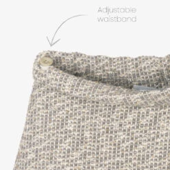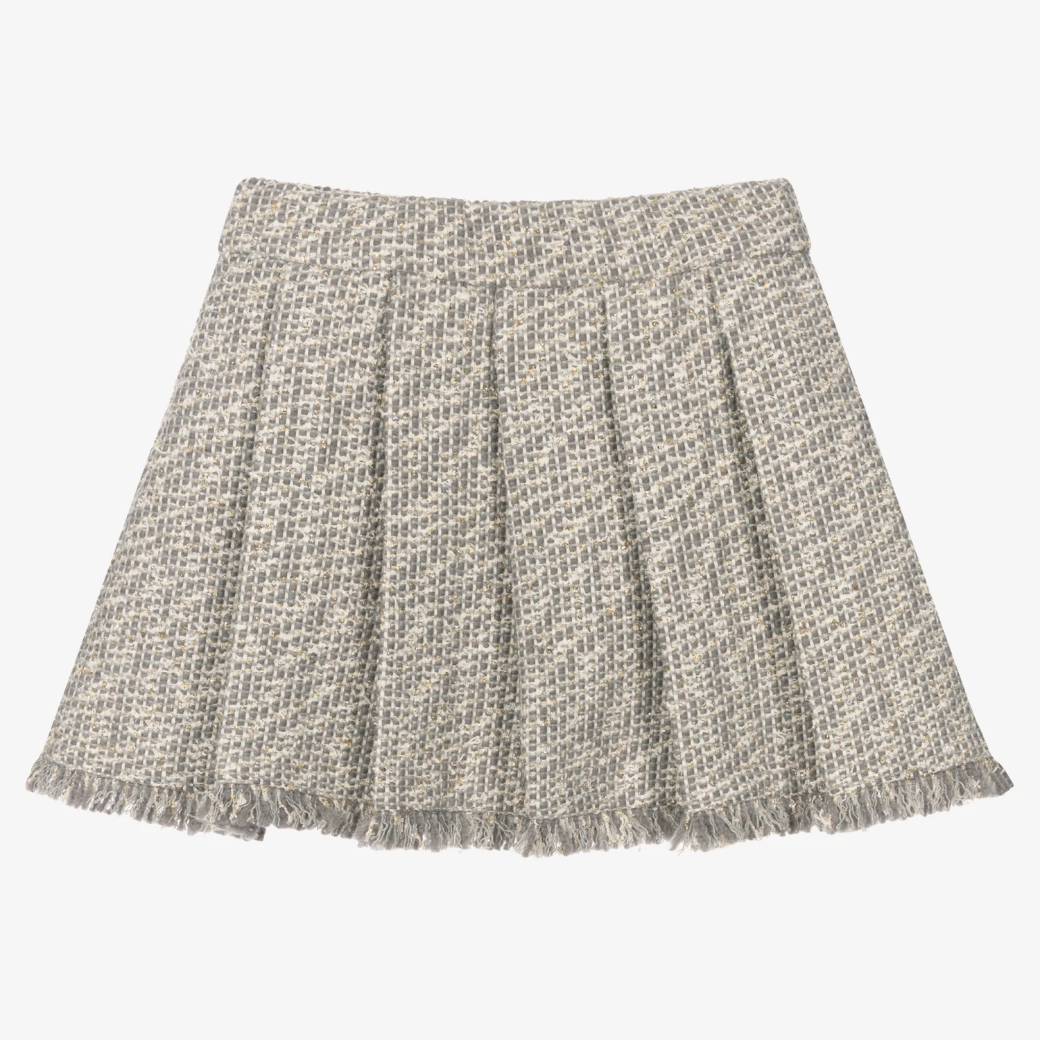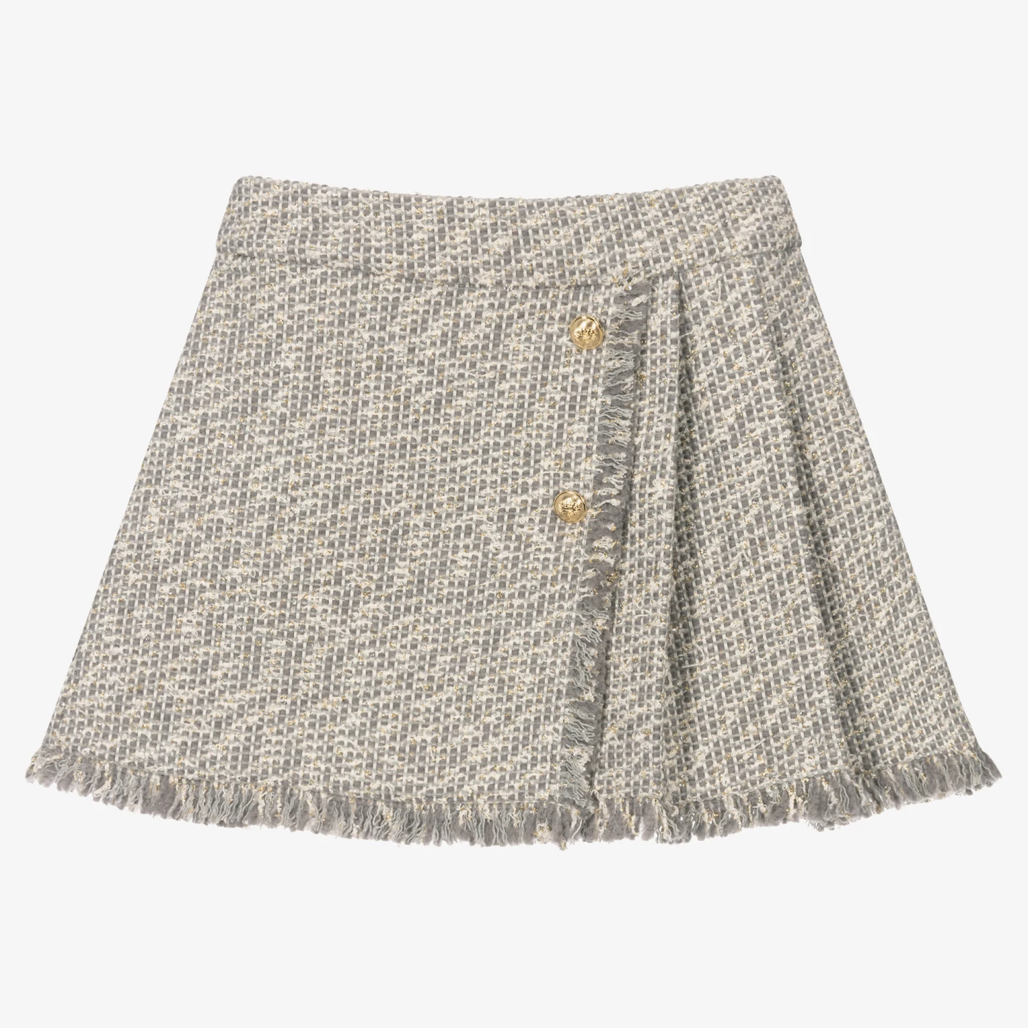 Grey and ivory tweed skirt for girls by Lapin House, with fringed trims. Made in a soft cotton and wool blend, it sparkles with glittery gold thread in the weave. In the style of a kilt, it is pleated on one side and around the back. There are decorative gold crested buttons on the front and a concealed zip fastening on the side.