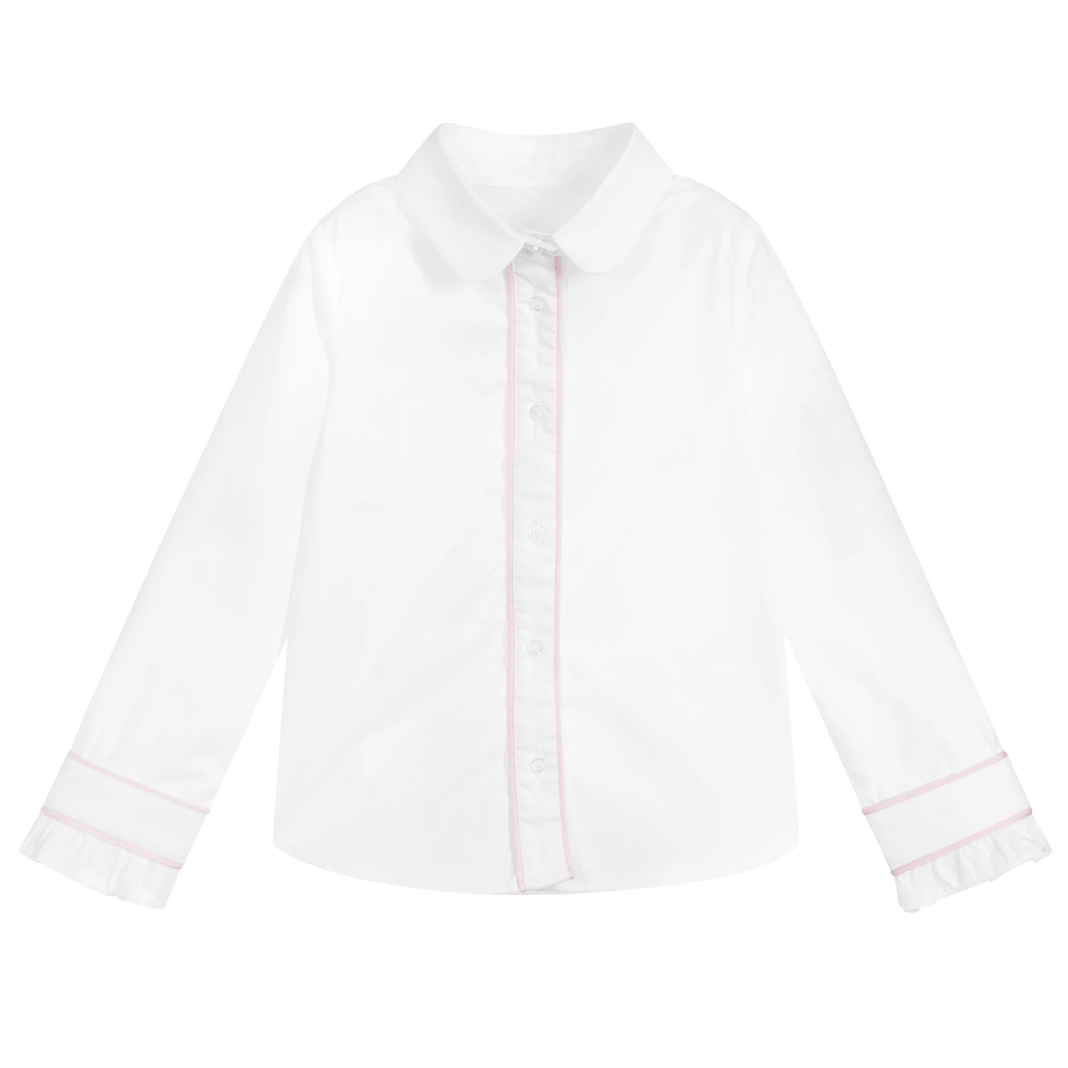 Girls white shirt from Lapin House, with a pretty pink velvet trim. It is made in soft, mid-weight cotton, with a slight stretch. The cuffs have ruffle detail and the top button and cuff buttons have diamanté detail.