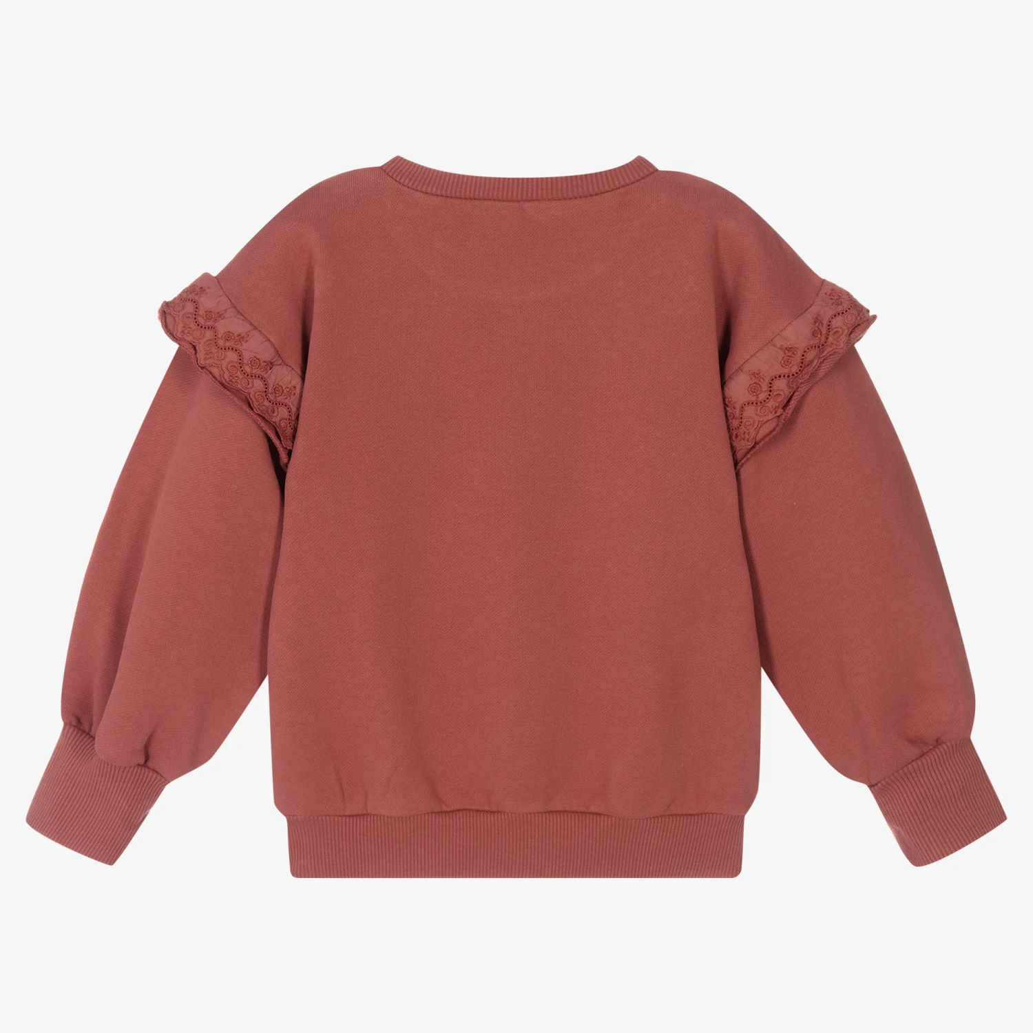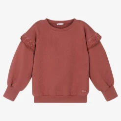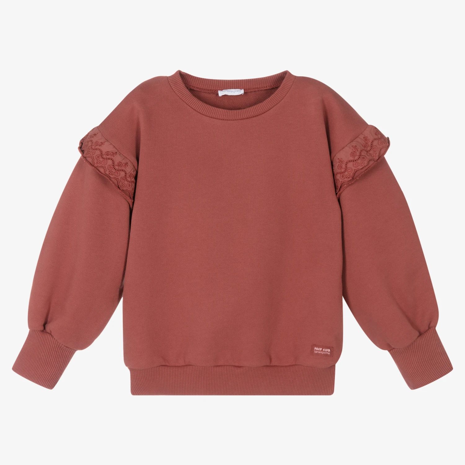 Dusky red sweatshirt for girls by Laranjinha, made from soft mid-weight cotton jersey. Classically styled with a crew neck and ribbed trims, it has wide sleeves and beautiful embroidered ruffles on the shoulders giving a feminine finish.