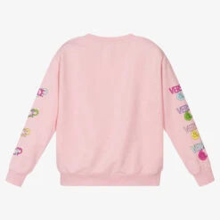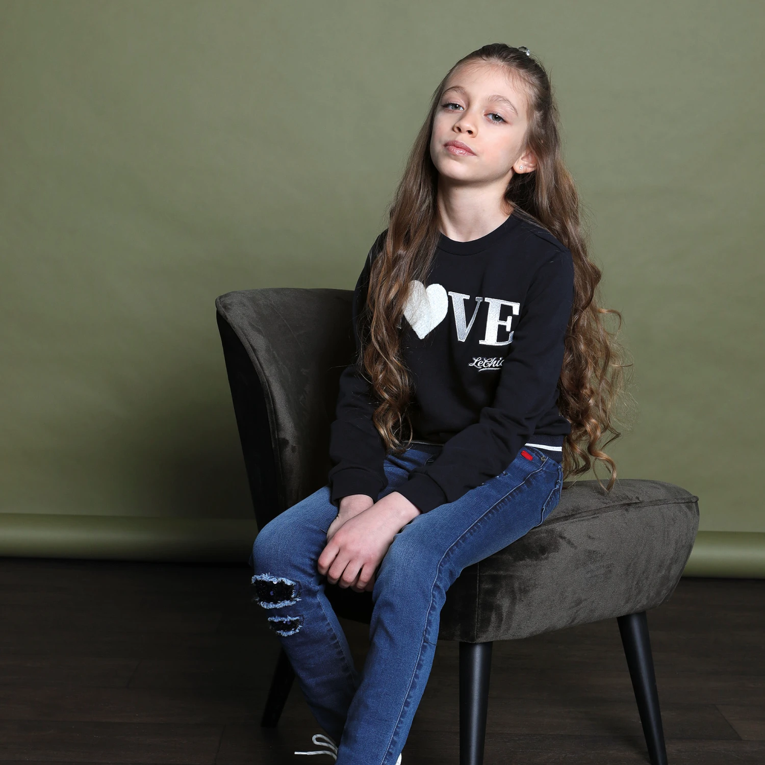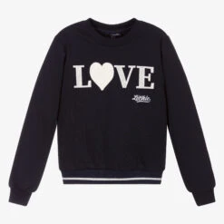 Navy blue sweatshirt for girls by Le Chic. Made in comfortable cotton jersey, it has ‘Love’ and the brand’s logo across the front in white embroidered appliqués. The ribbed hemline is striped in white and glittery silver.