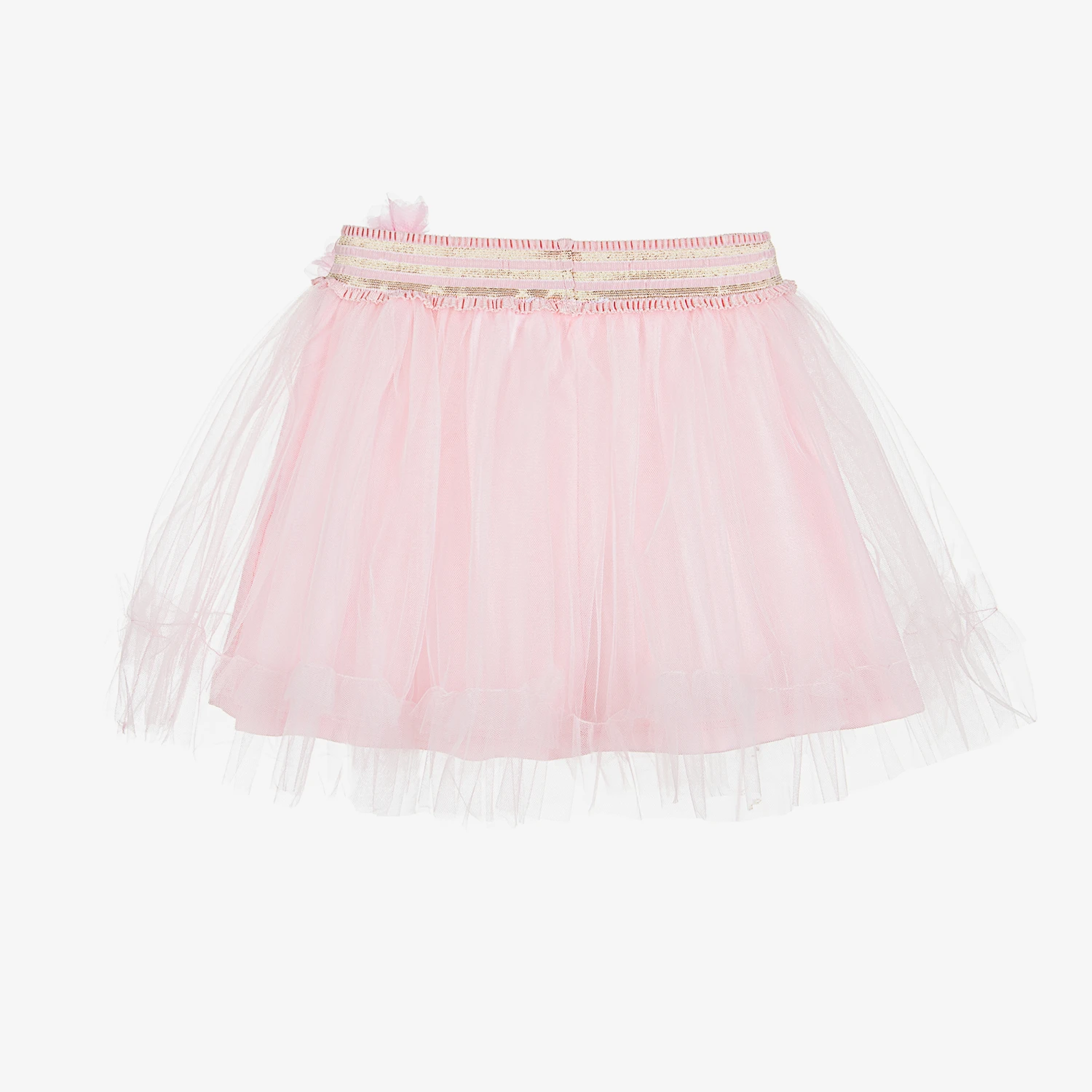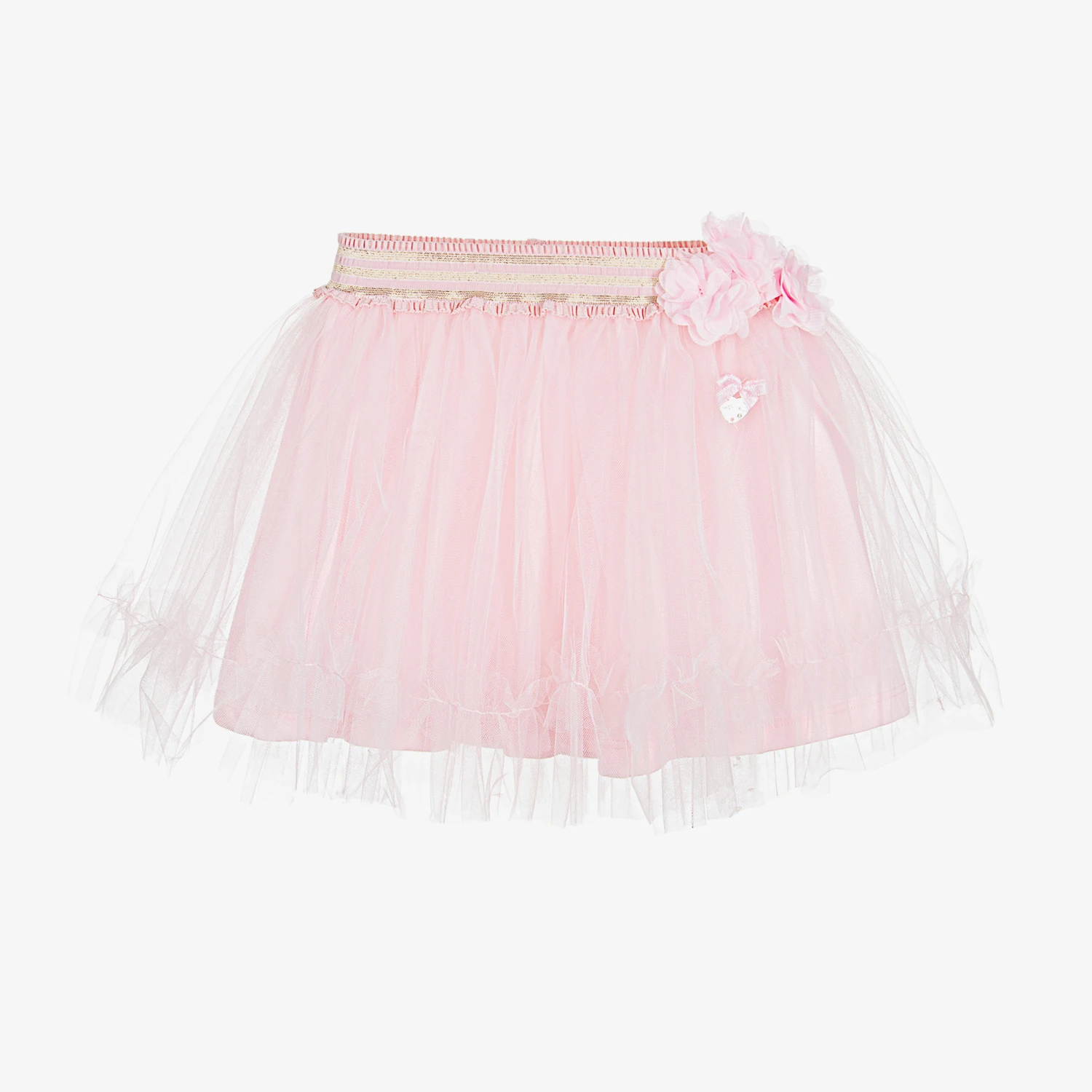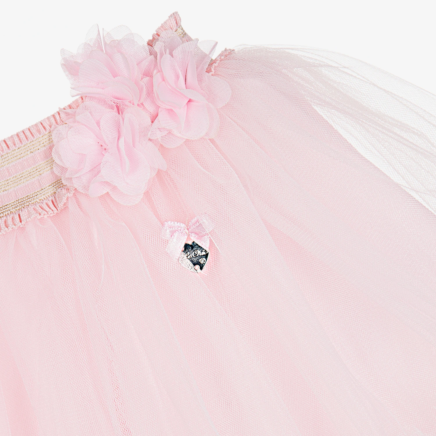 Pretty pink pettiskirt for girls by Le Chic, finished with the brand’s silver heart logo tab on the front. Made from layers of gathered tulle and lined in soft jersey for added comfort, it has an elasticated waistband with gold thread and 3D flower appliqués for a glamorous finish.