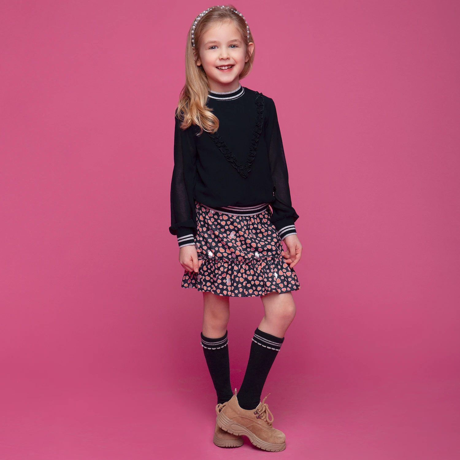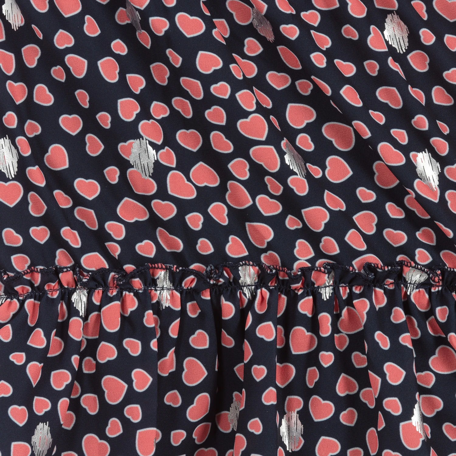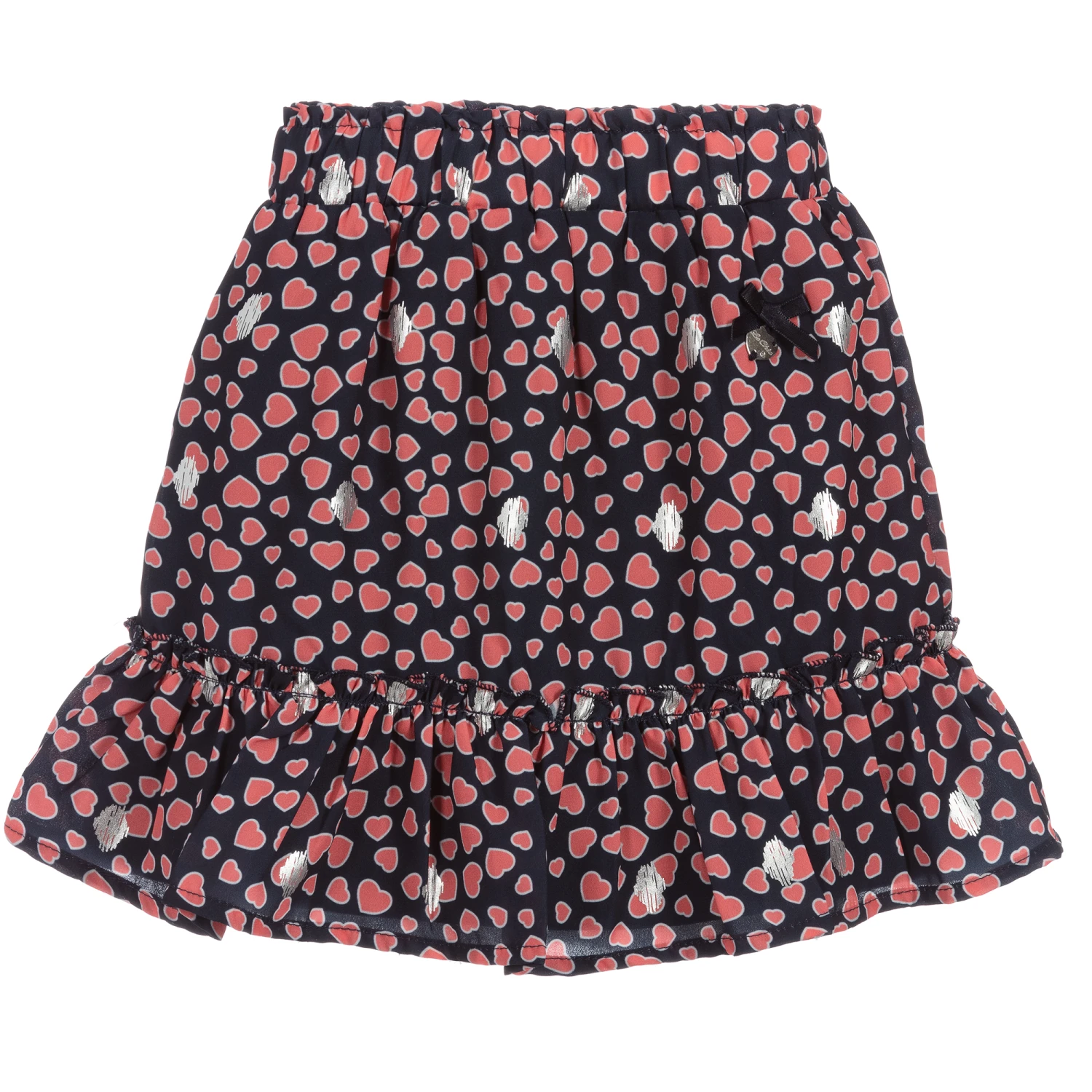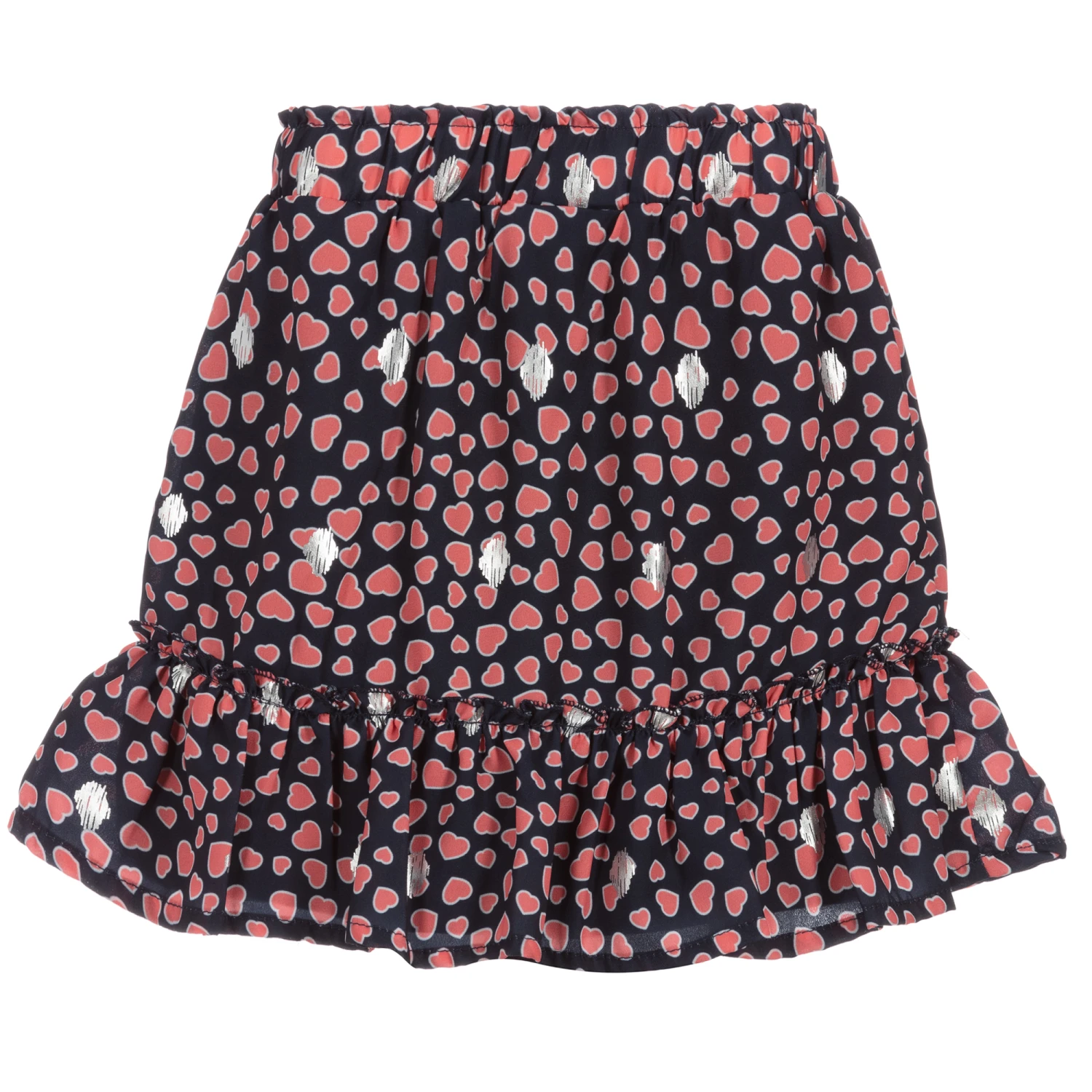 Girls sweet navy blue and red heart print skirt from Le Chic, with silver print detail. It is made in lightweight chiffon, with a soft jersey lining. The hem is ruffled and the waistband is elasticated.