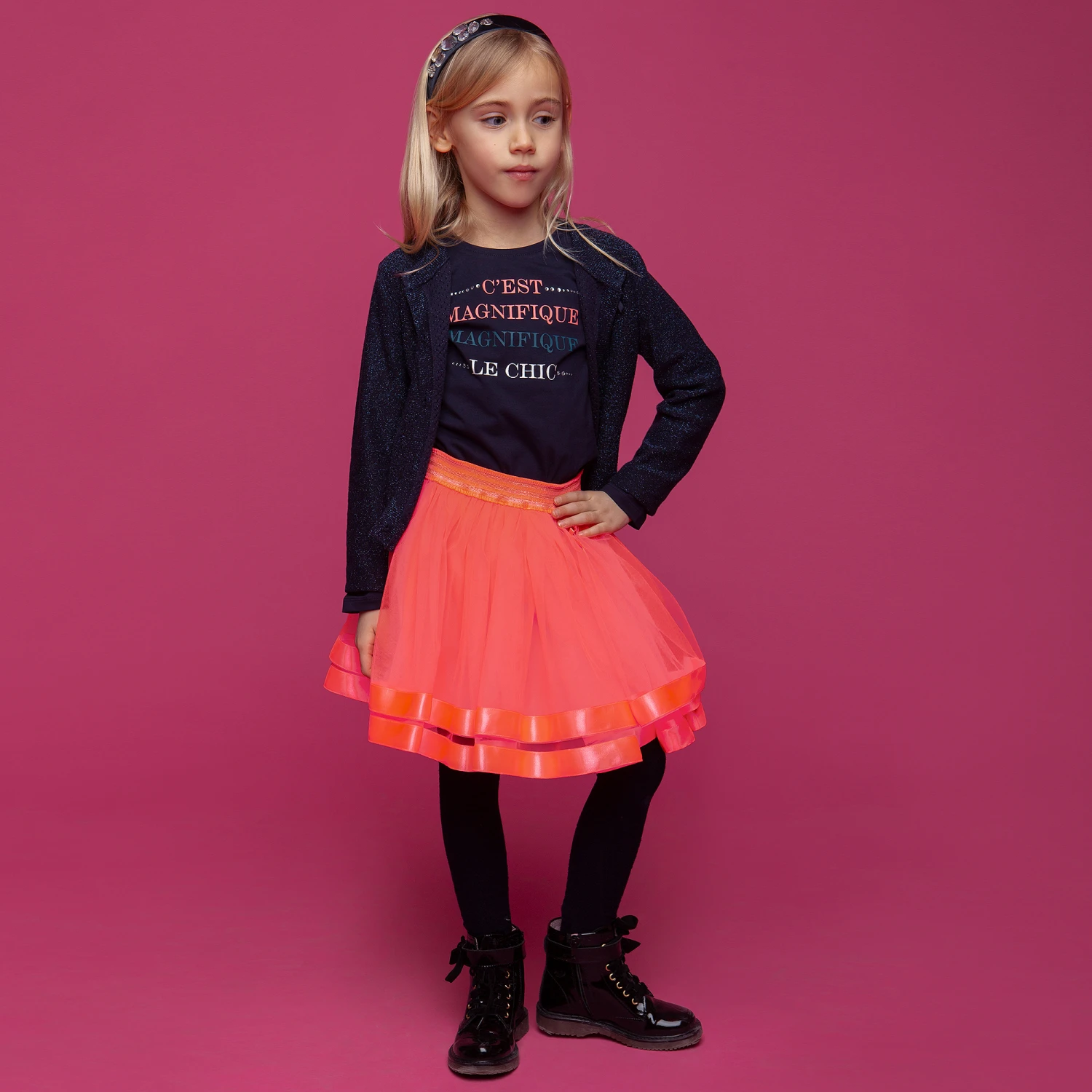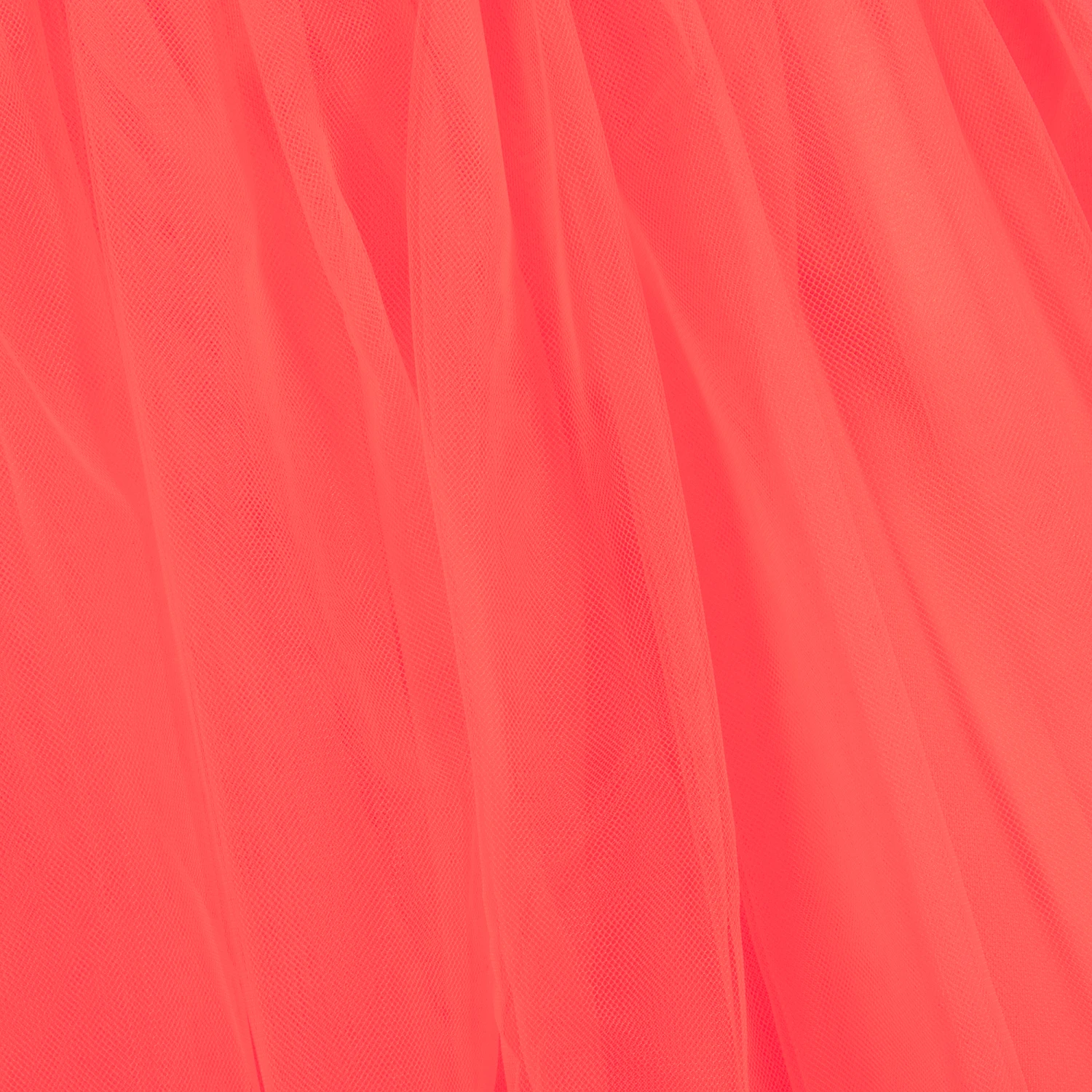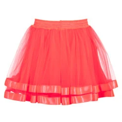 Girls neon coral pink tutu skirt by Le Chic, made in layers of soft tulle. It has satin ribbon around the hem and a comfortable jersey lining. There is a bow and gold logo charm near the elasticated waistband.