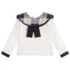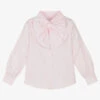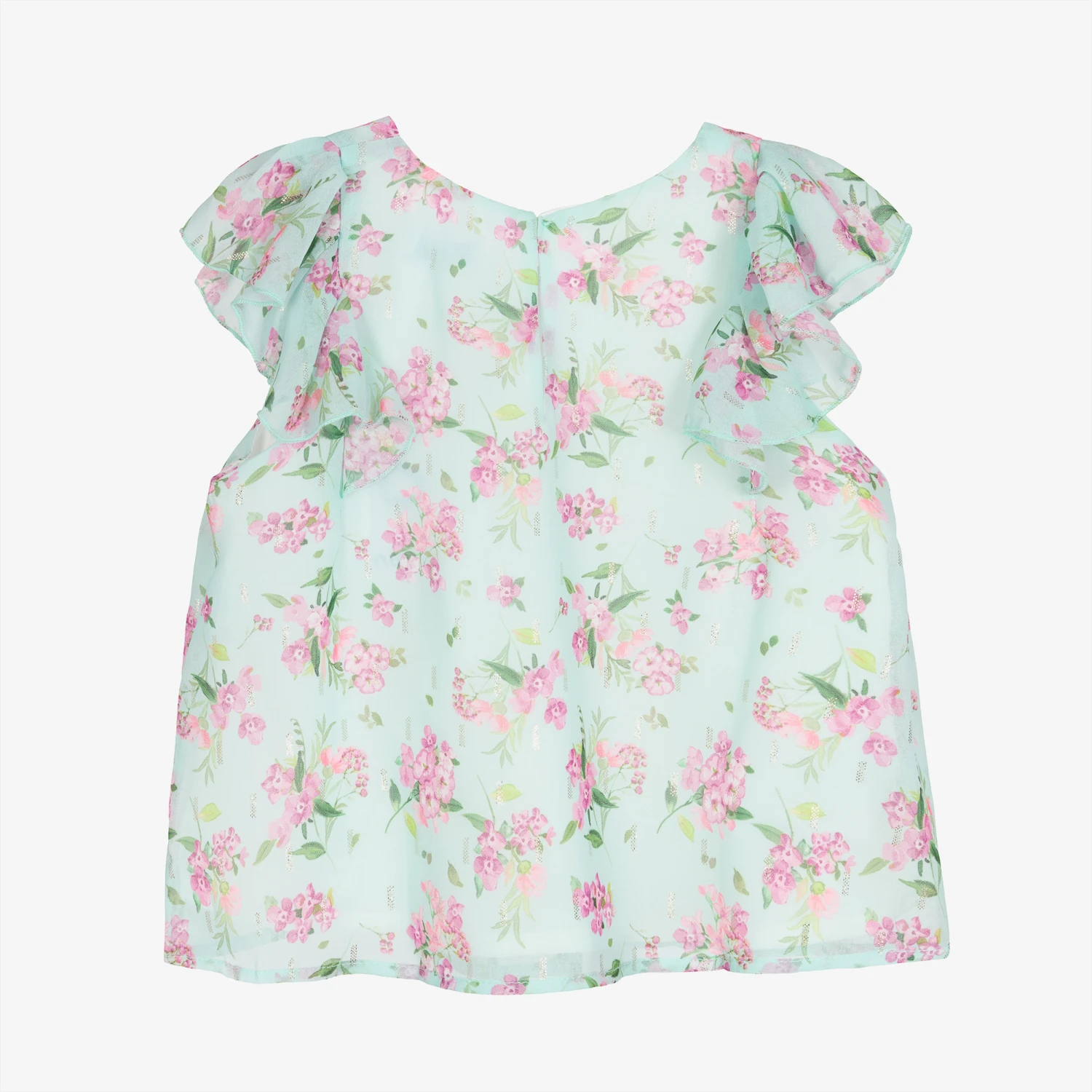 Girls lovely pale blue crêpe chiffon blouse by Mayoral, in a pink and green floral print with a subtle gold pattern for a little sparkle. Sheer and lightweight, it has soft pleated detail on the front and pretty ruffles over both shoulders. It is fully lined for comfort and there is a button fastening on the back for ease of dressing.