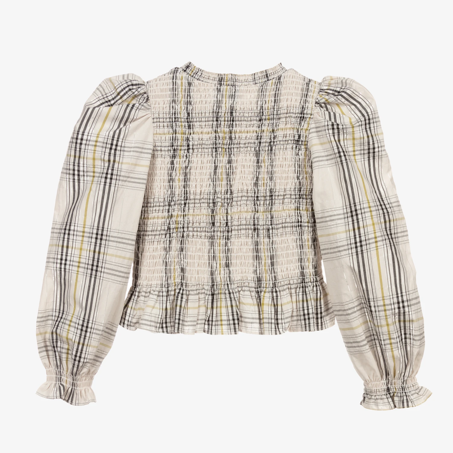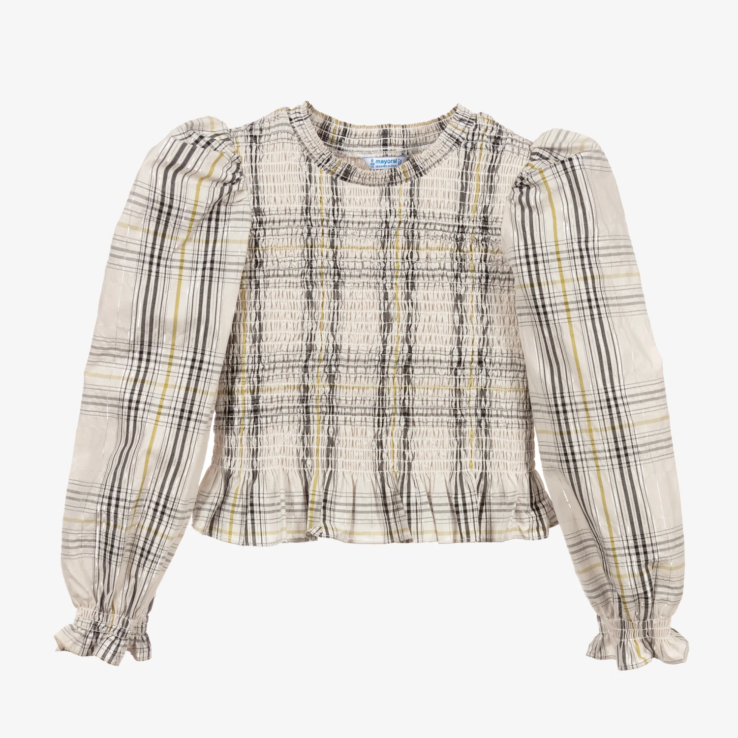 Ivory blouse for girls, by Mayoral. Made from soft lightweight cotton, it has a grey, green and silver check print with gathered sleeves, and a pretty ruffle hem.