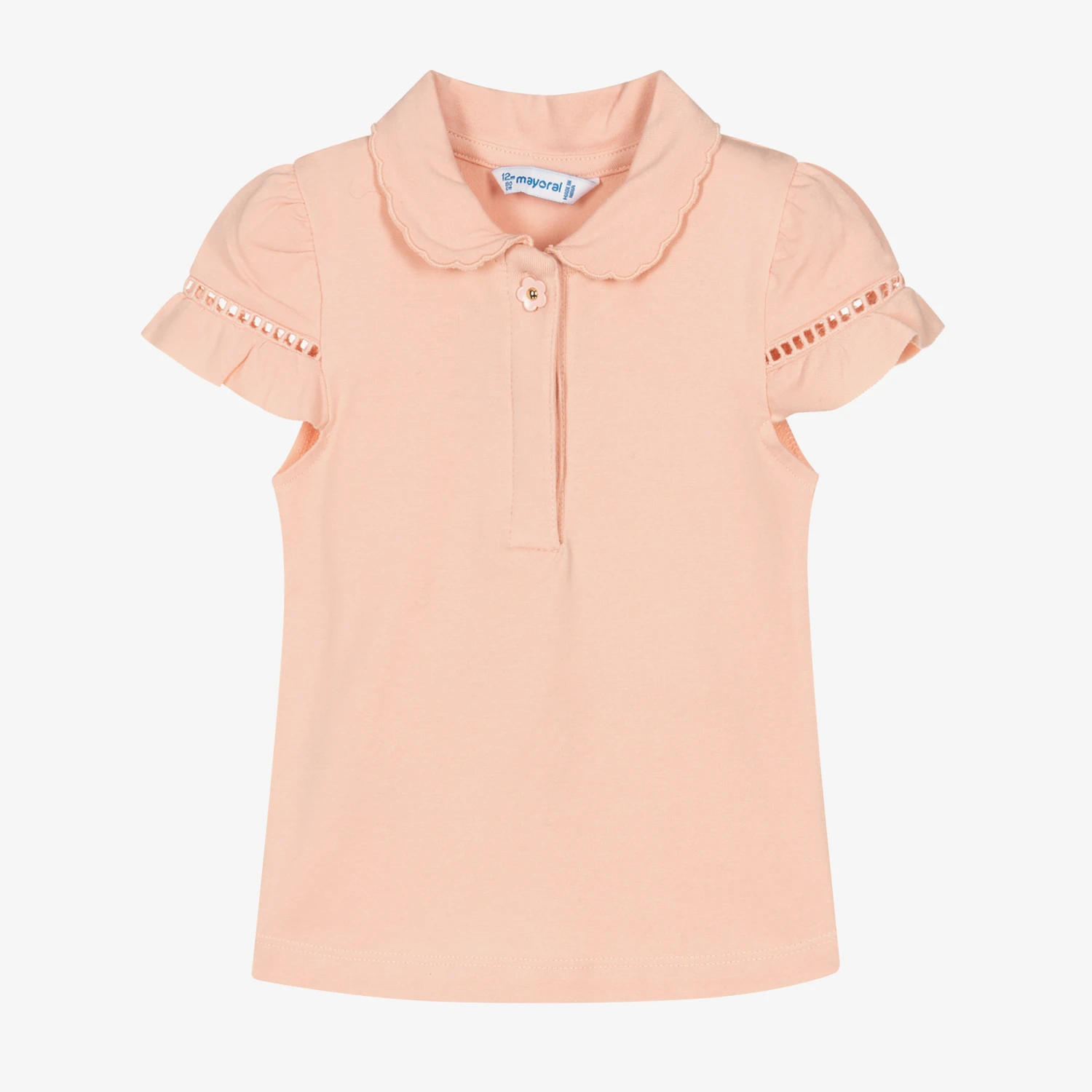 Cute pale pink sustainable cotton polo shirt for little girls by Mayoral. Made in soft, stretchy jersey for comfort, it has a scalloped collar, with stylish cut-work and frills on the puffed sleeves. It has a sweet, flower-shaped button on the front with a shiny gold centre for a girly finishing touch.