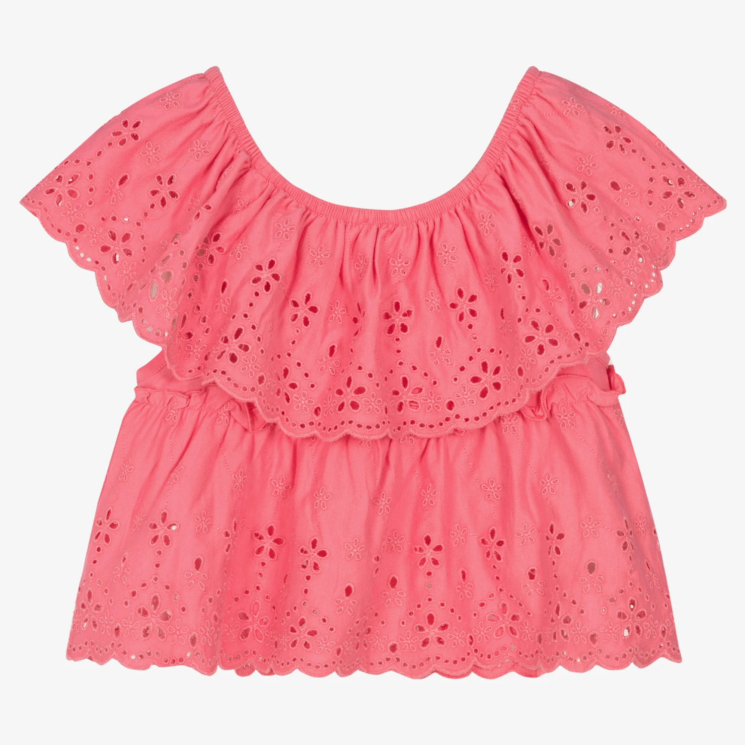 Beautiful pink blouse for girls by Spanish brand Mayoral, made in soft sustainable cotton jersey. Lightweight and flowy, it has pretty broderie anglaise detailing, a ruffle trimmed bodice and an elasticated neckline for a flattering, off-the-shoulder style.