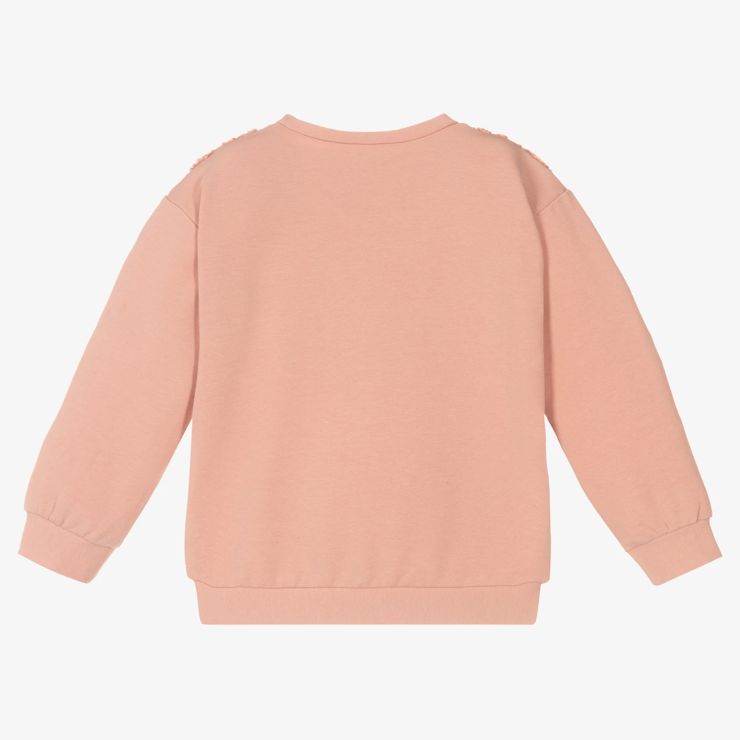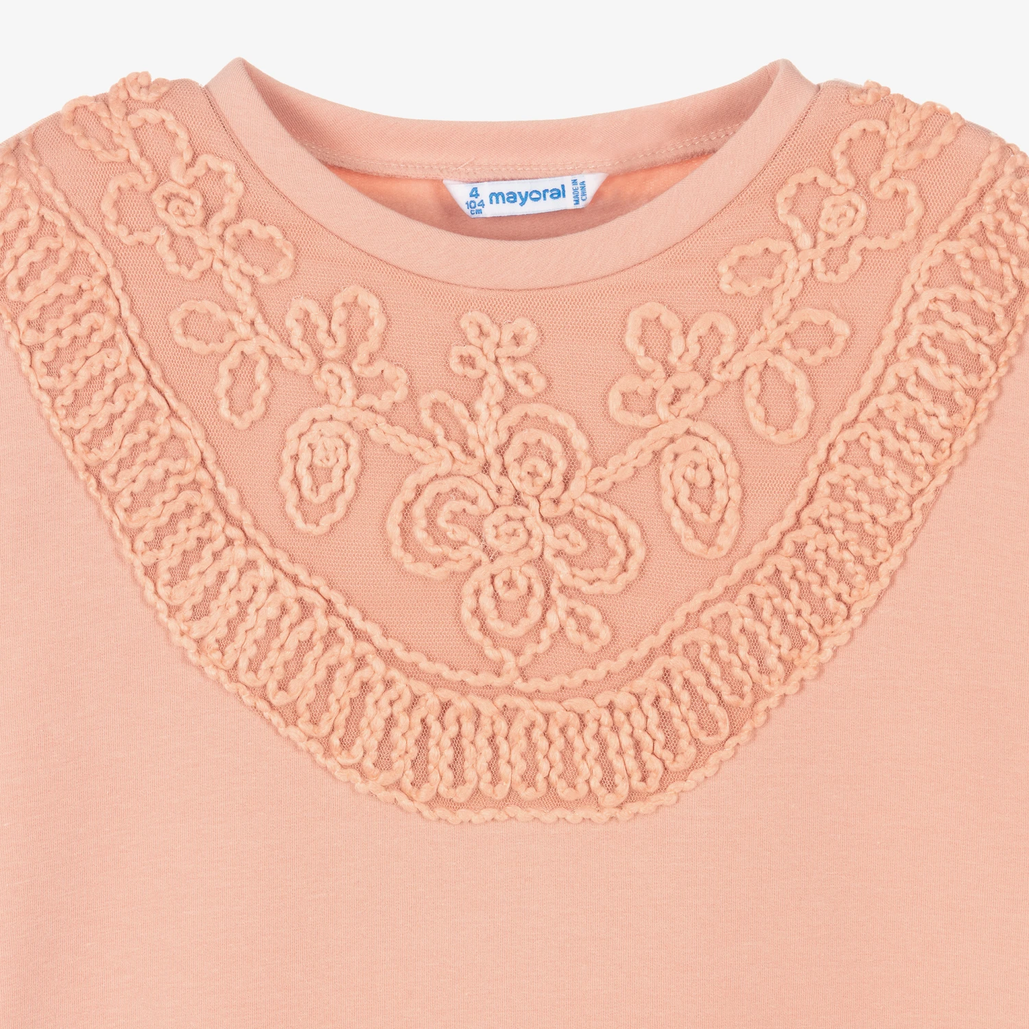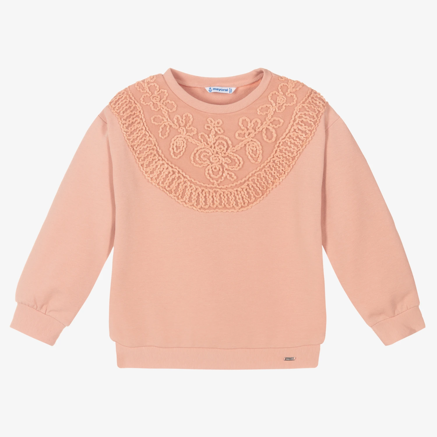 Lovely pink sweatshirt for girls, by Mayoral. Made in soft cotton-blend jersey with a brushed inside, it has a pretty tulle overlay on the front with a floral embroidered design, and a metal logo plate on the hem.
