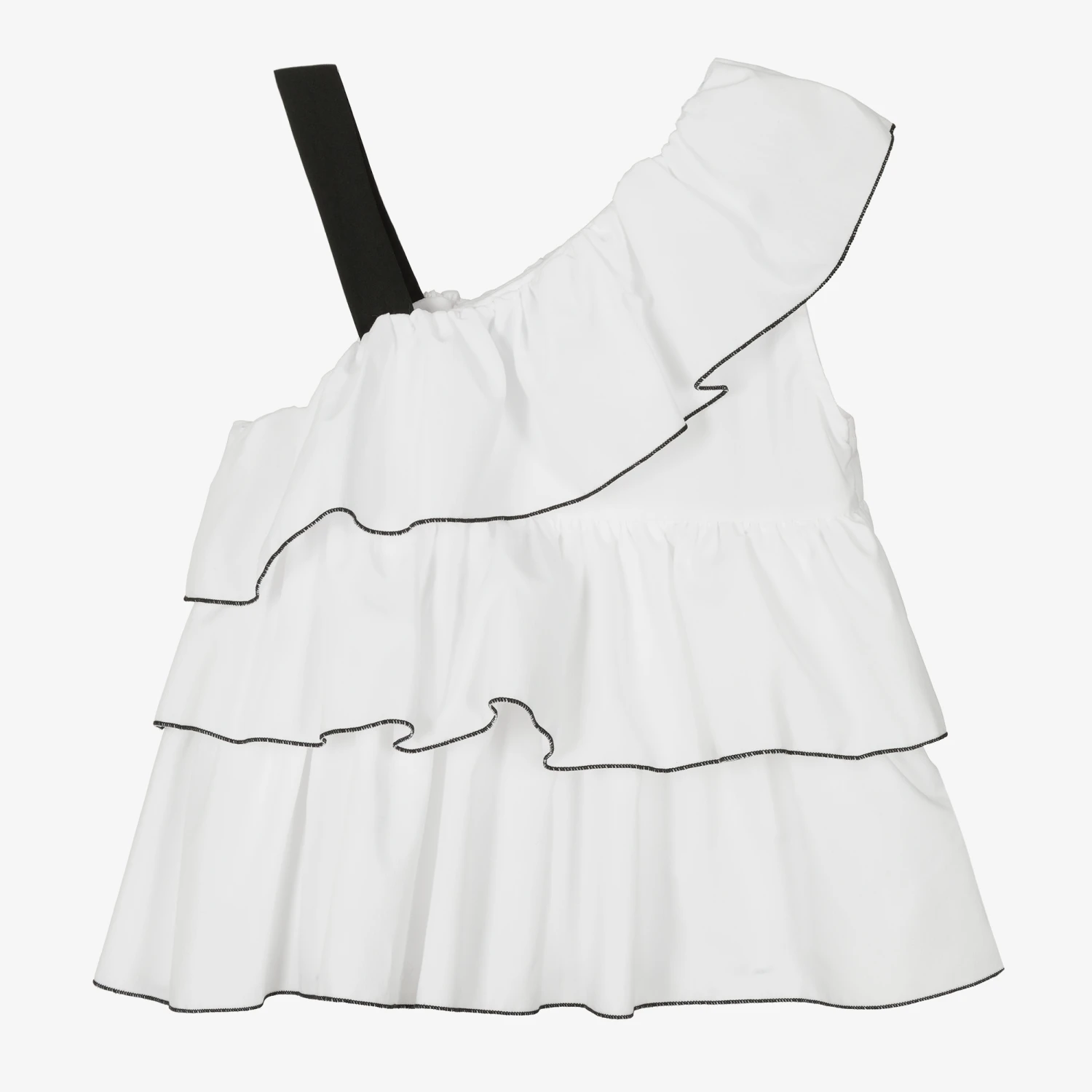 White blouse for girls by Mayoral, made in a lightweight cotton poplin blend. It has a large ruffle over one shoulder and a wide black strap over the other shoulder. This Stylish top is cool and comfortable to wear with pretty layers edged with black stitching and a concealed side zip.