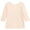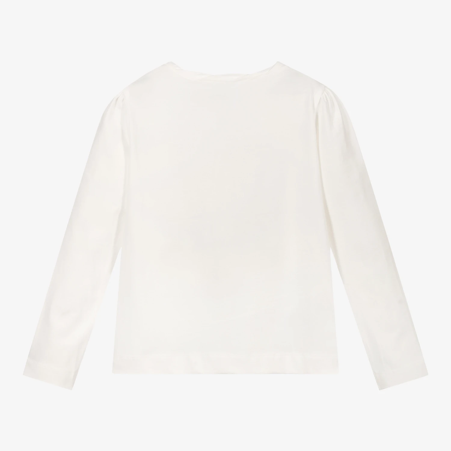 Ivory long-sleeved top for girls by Mayoral, made in soft sustainable cotton jersey. It has a black and beige girl print on the front with the sequinned word ‘Shhhh’ and matching flowers.