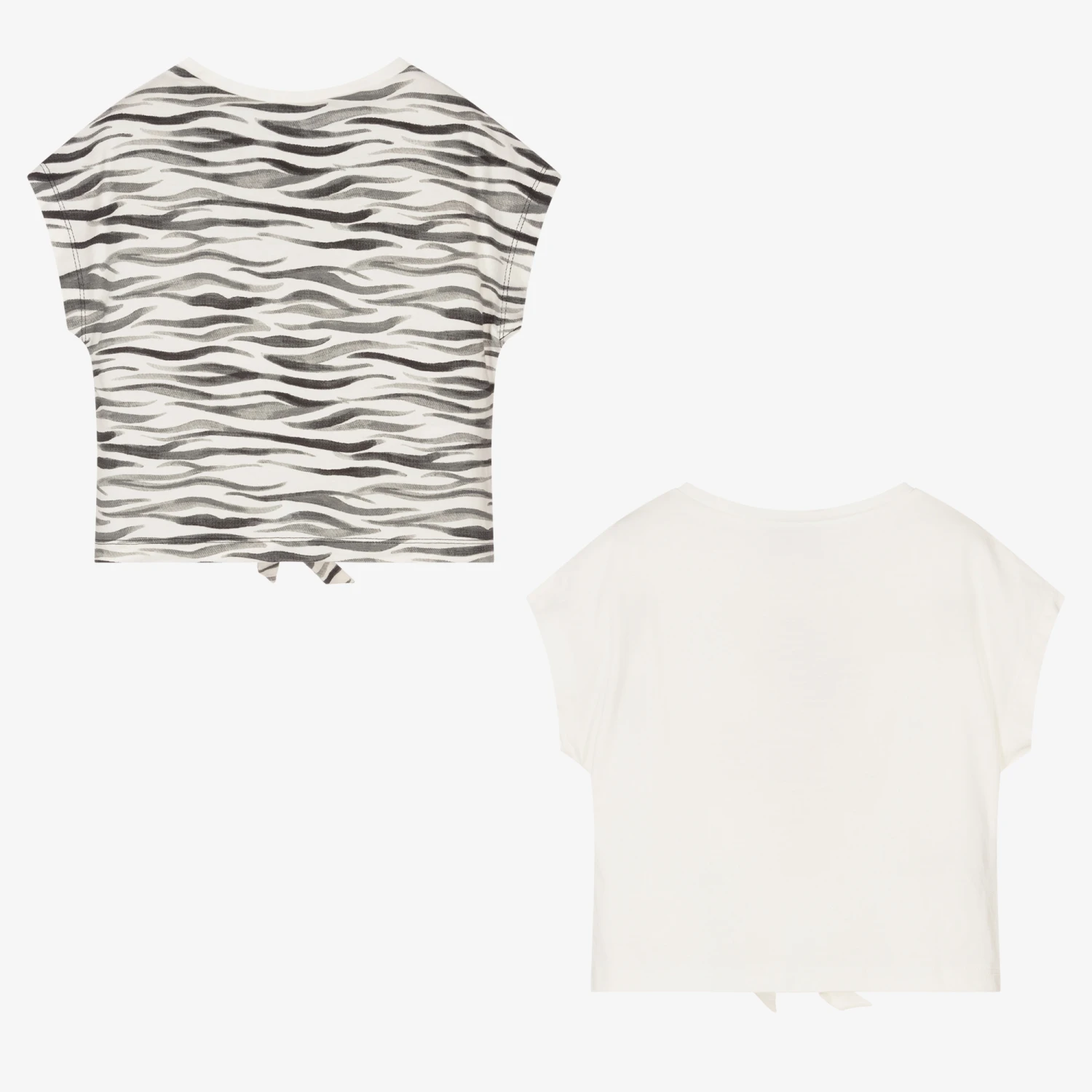 Cool ivory and black purple set of two T-shirts for girls, by Mayoral. Made in soft cotton jersey, one of the T-shirts has a sweet girl holding a bouquet of flowers printed on the front in pink and yellow, with a tie-knot detail on the hem. The other T-shirt has a fun black zebra print all-over, with ‘ZEBRA’ printed on the front and a tie-knot detail on the hem.