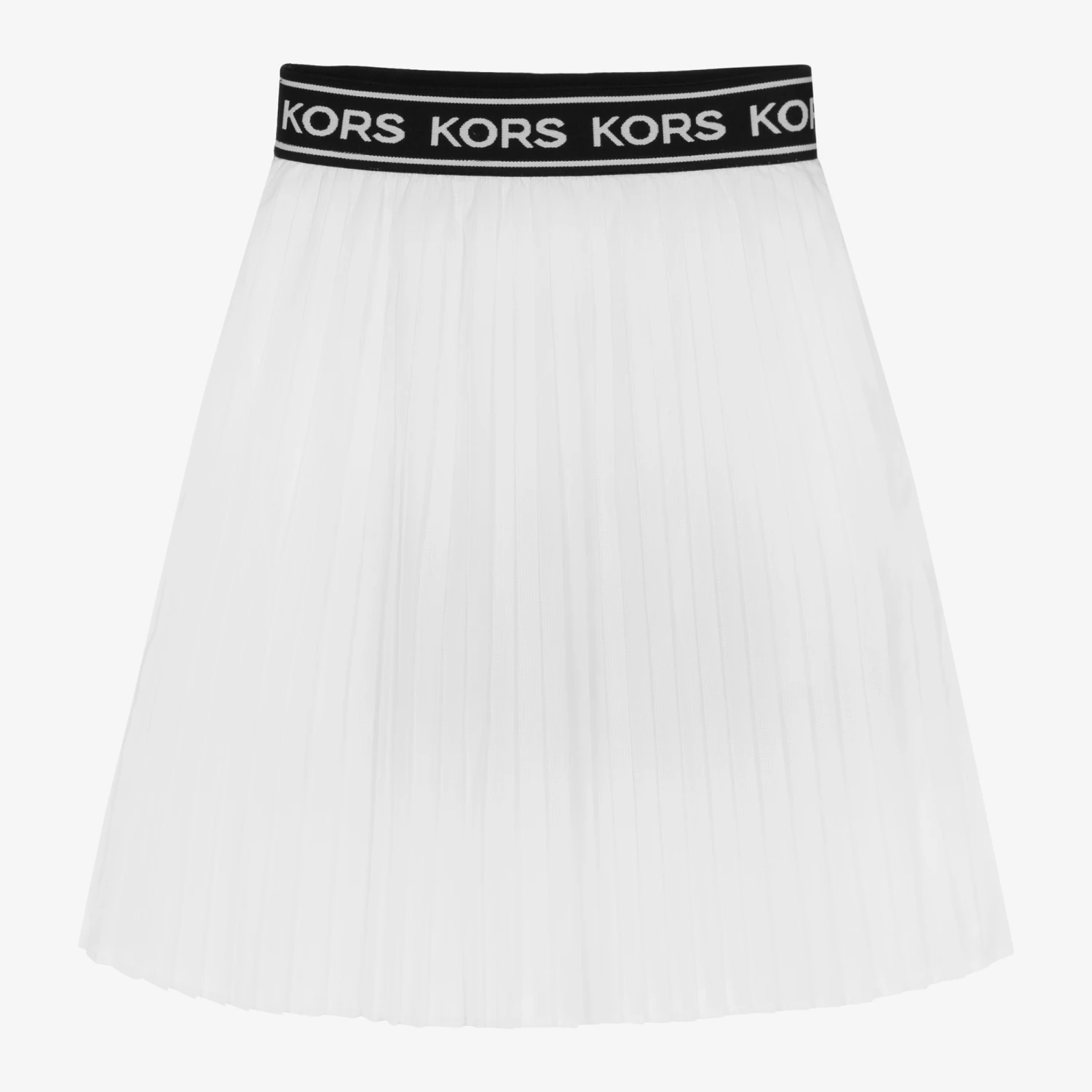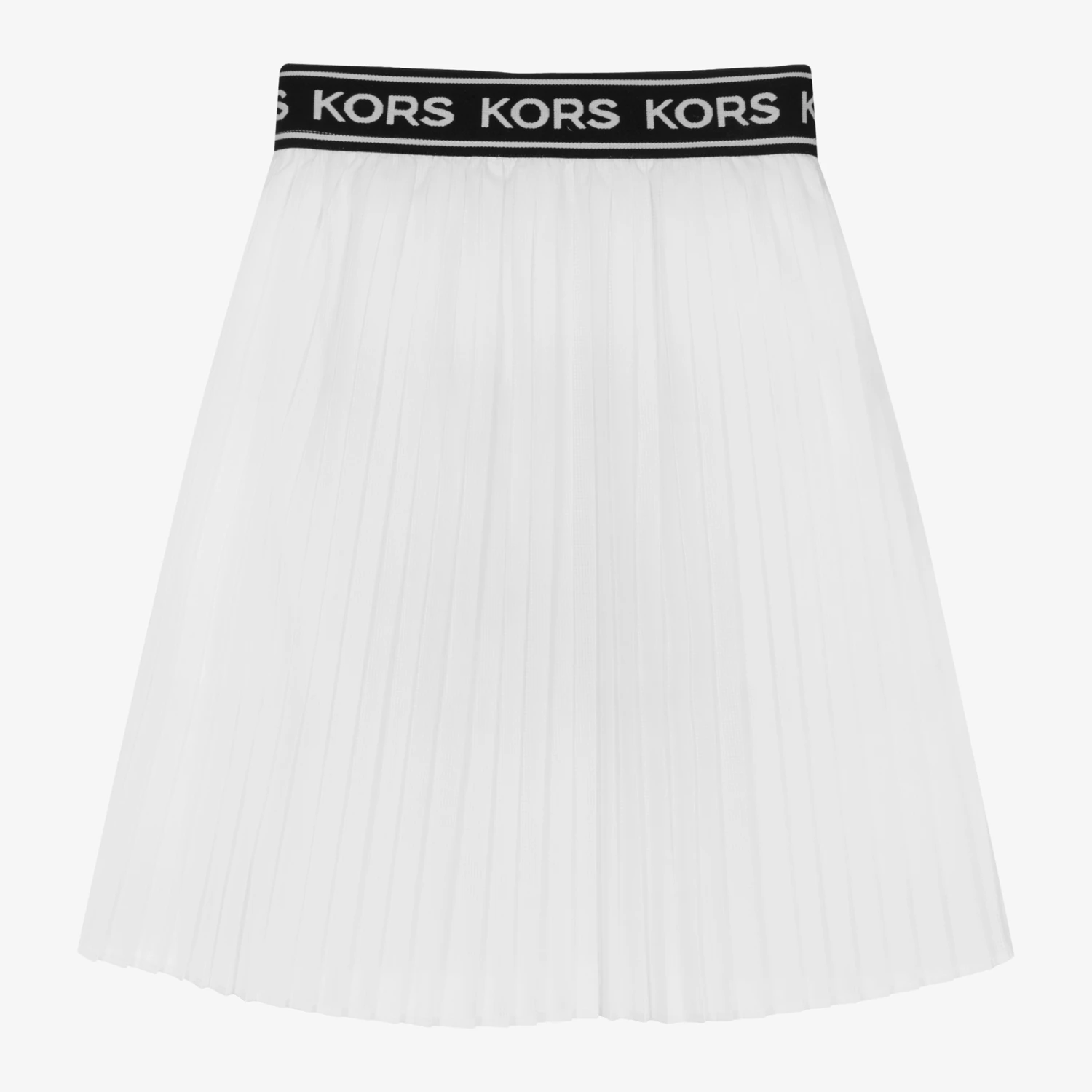 Girls pleated white skirt by American brand Michael Kors, made in silky ripstop fabric. Sitting stylishly below the knee, it has an elasticated black and white logo waistband for a great fit and is comfortably lined in soft viscose.