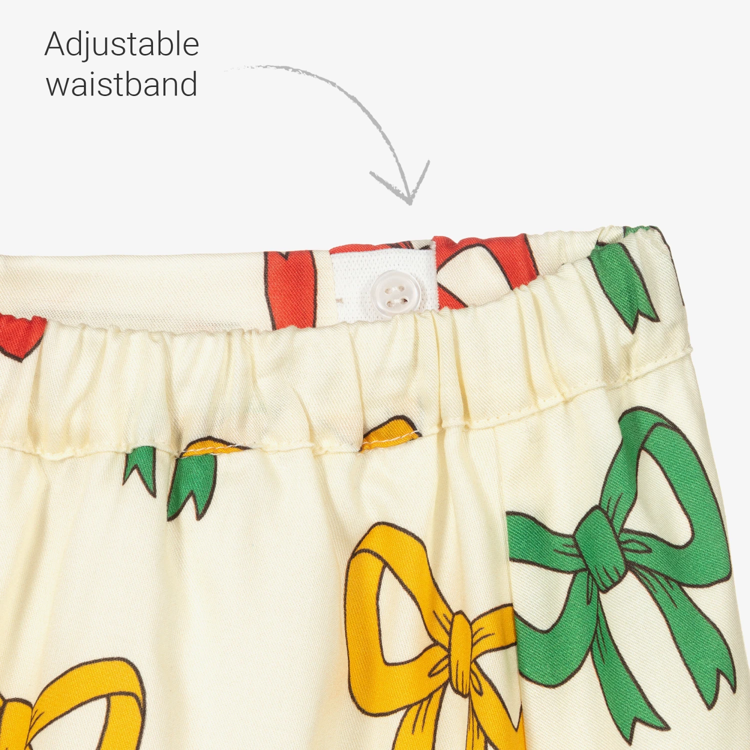 Made from sustainable lyocell, this lightweight ivory midi skirt for girls is by Mini Rodini. With an elasticated adjustable waist, it has a colourful bow print throughout and a white cotton lining.