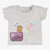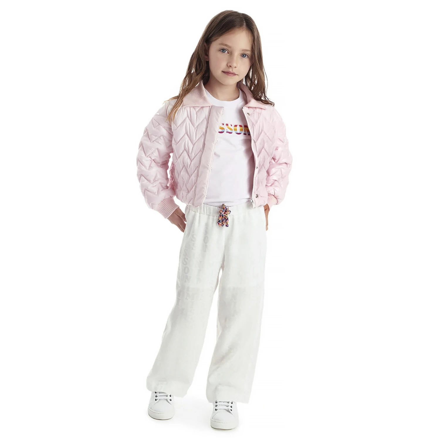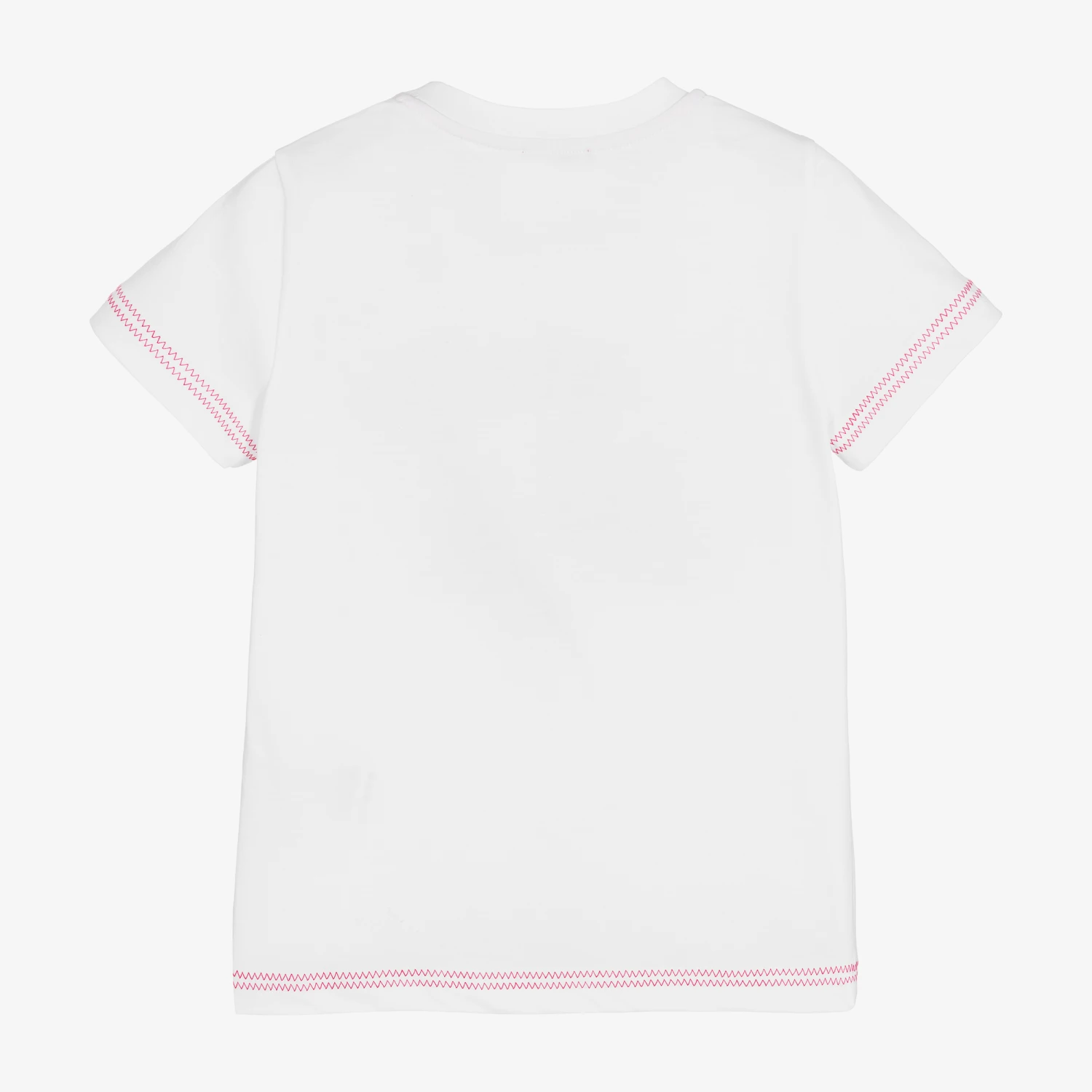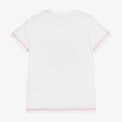 White crew neck T-shirt by luxury Italian brand, Missoni. It has a bold logo across the front, exquisitely embroidered in rainbow colours. Made from soft, organic cotton jersey, it has red zigzag stitching on the sleeves and hem, a nod to the fashion house’s iconic pattern.