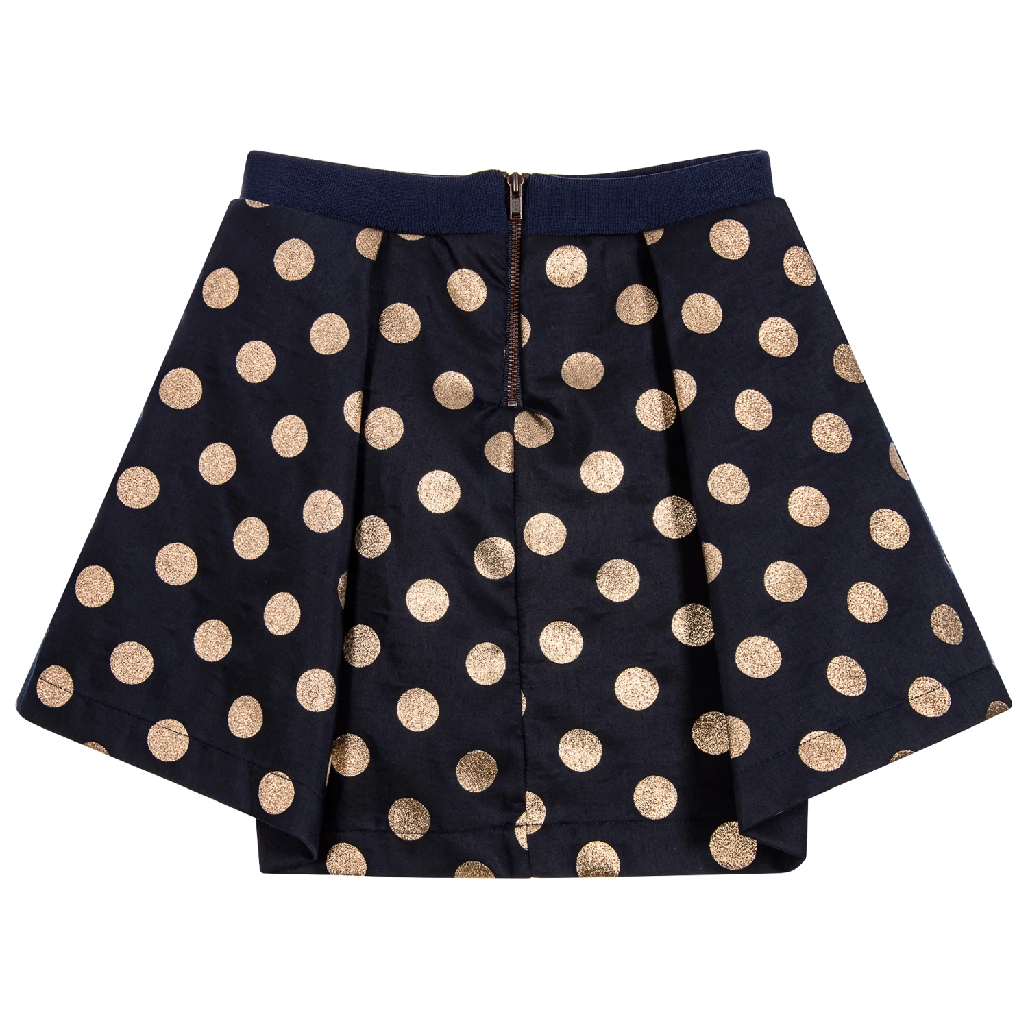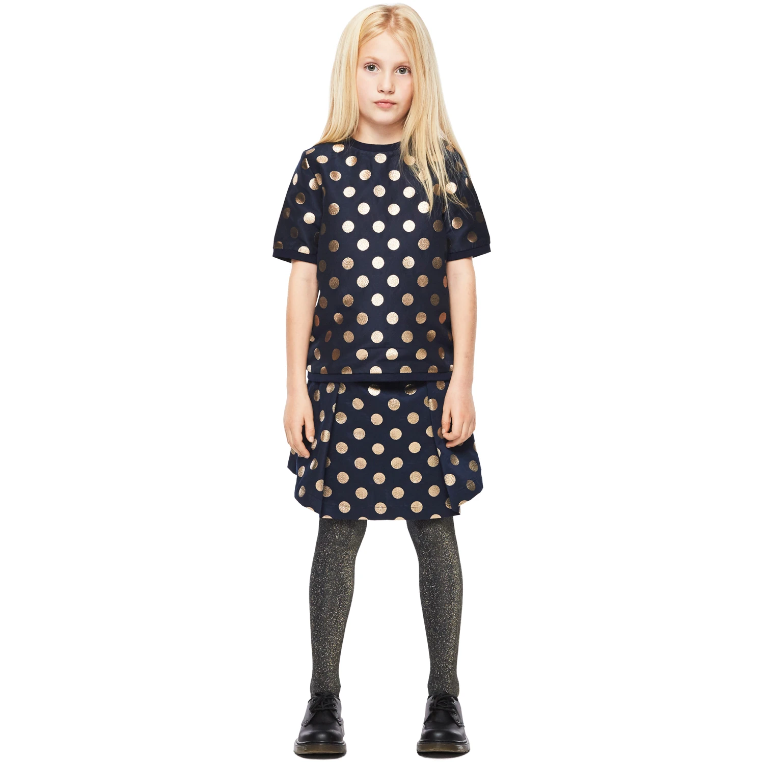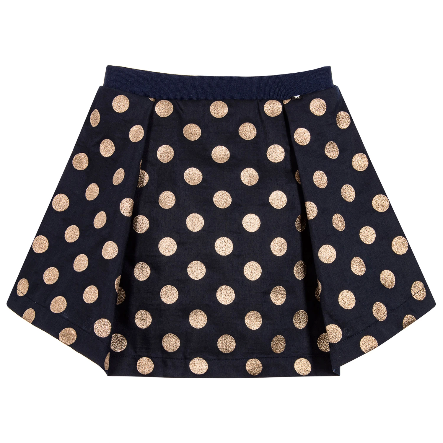 Patterned with golden dots, this navy blue ‘Bree’ skirt by Molo is an elegant choice for girls. It is fashionably styled with broad pleats, and has a ribbed jersey waistband for a comfortable fit.
