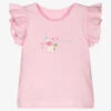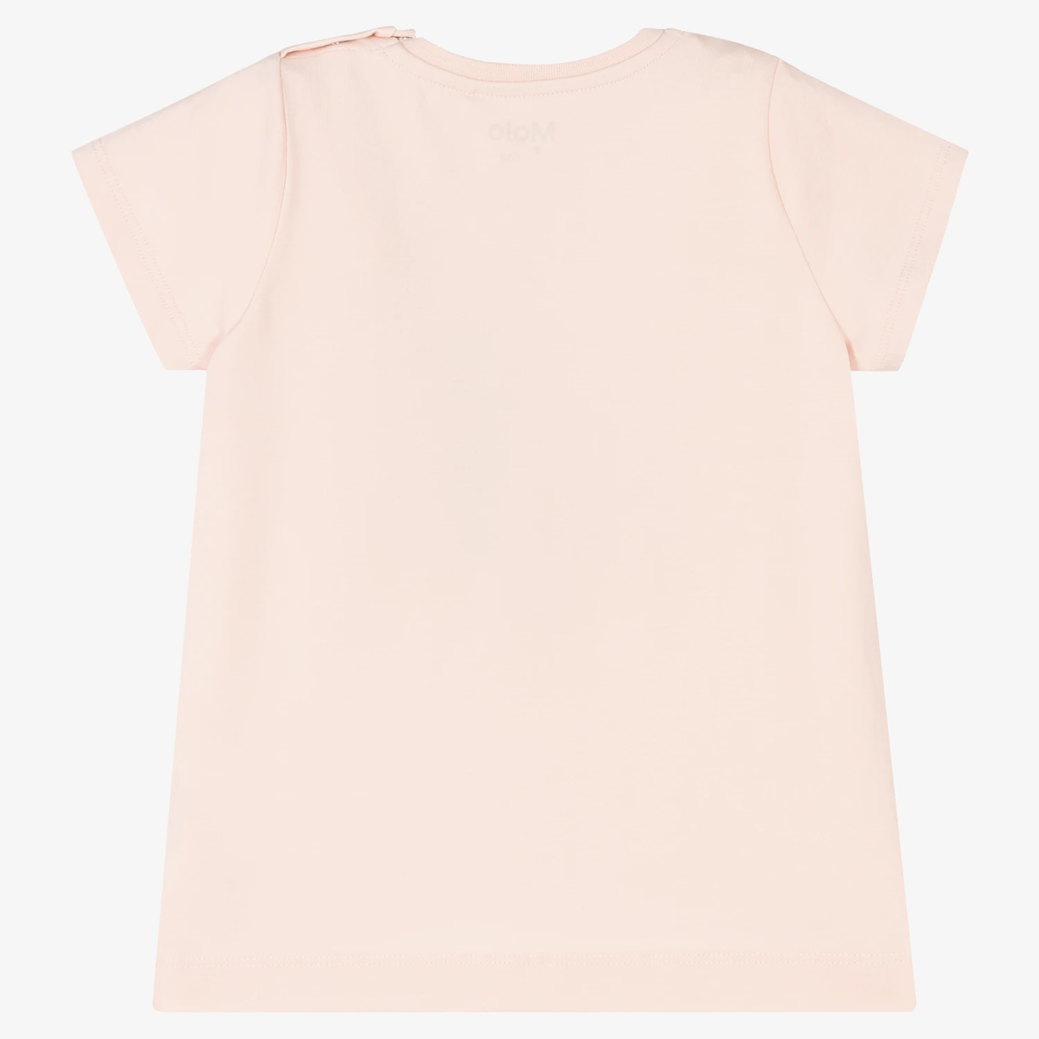Pale pink T-shirt for little girls by Molo, made in soft and stretchy organic cotton jersey. Beautifully printed with two vibrant birds, it has pale pink sleeves with a contrasting, soft shade of pink on the front panel. It can be slipped on over the head and secured with two useful popper fastenings on one shoulder.
