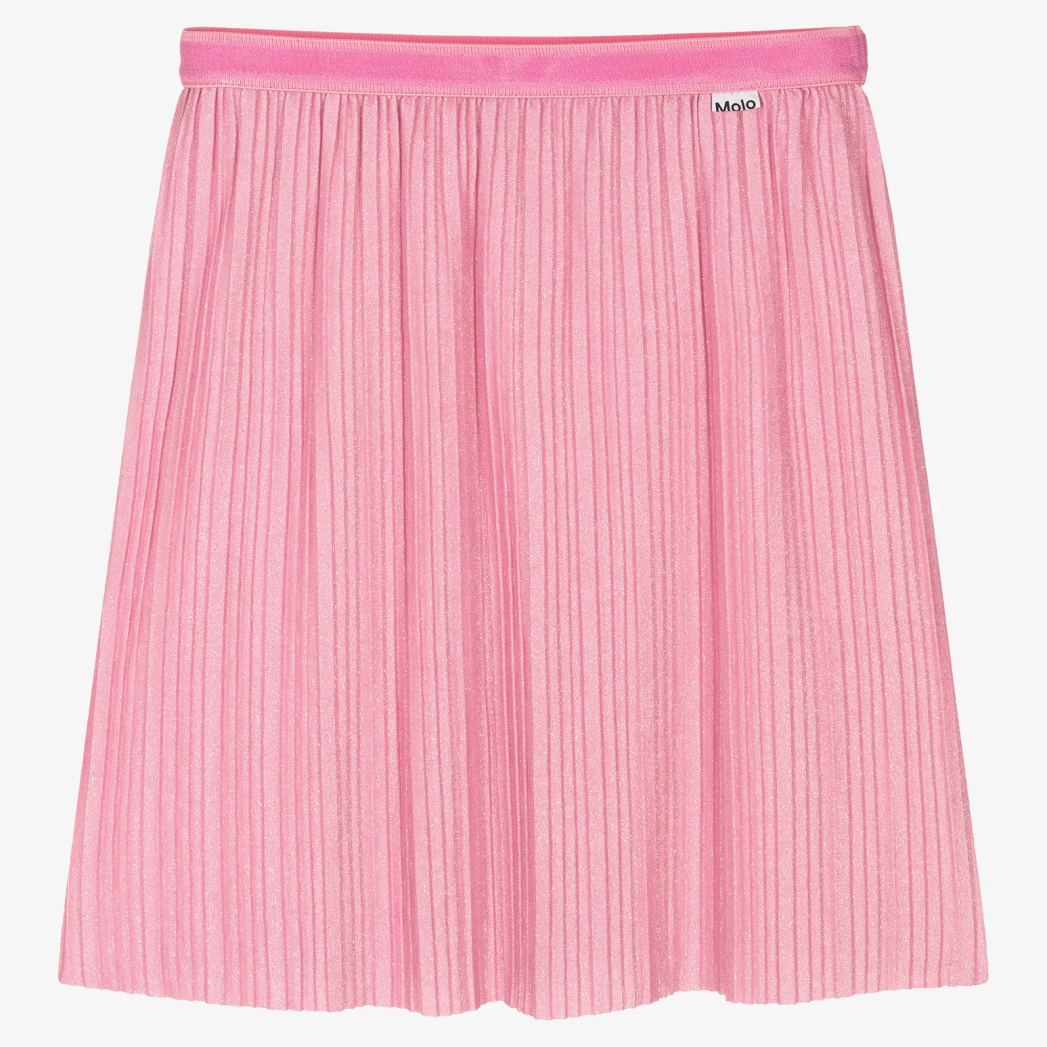 Pink pleated skirt for girls by Danish brand Molo, made in soft and stretchy glitter fabric. Fun and functional, this skirt has an elasticated waistband with a tag logo attached.