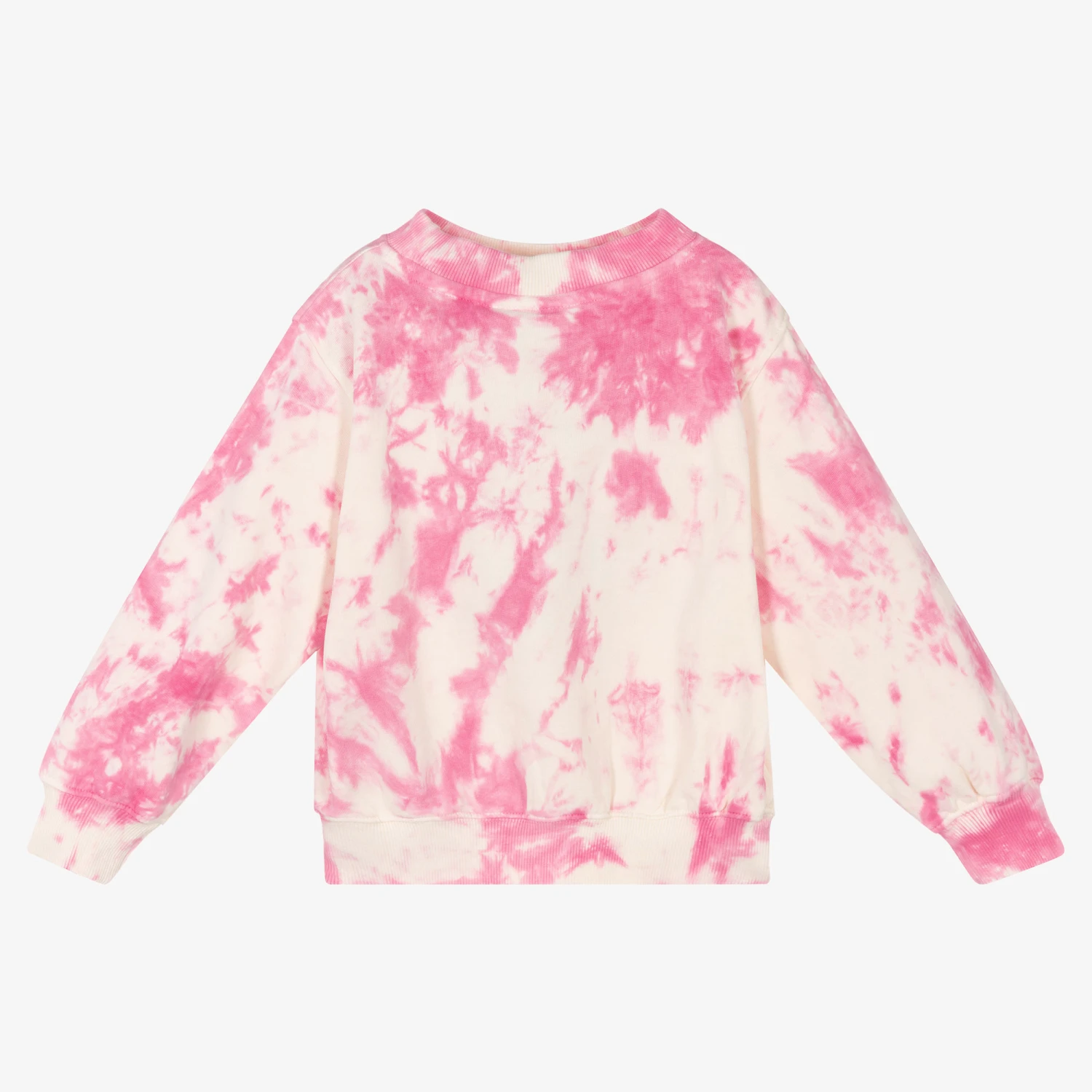 Pink and ivory tie-dye sweatshirt for girls by Danish brand Molo, made in soft organic cotton jersey. With a soft fleecy inside, this casual piece has a classic crew neck and ribbed trims to keep warmth locked in. There is a small logo tab on one side for a branded touch.