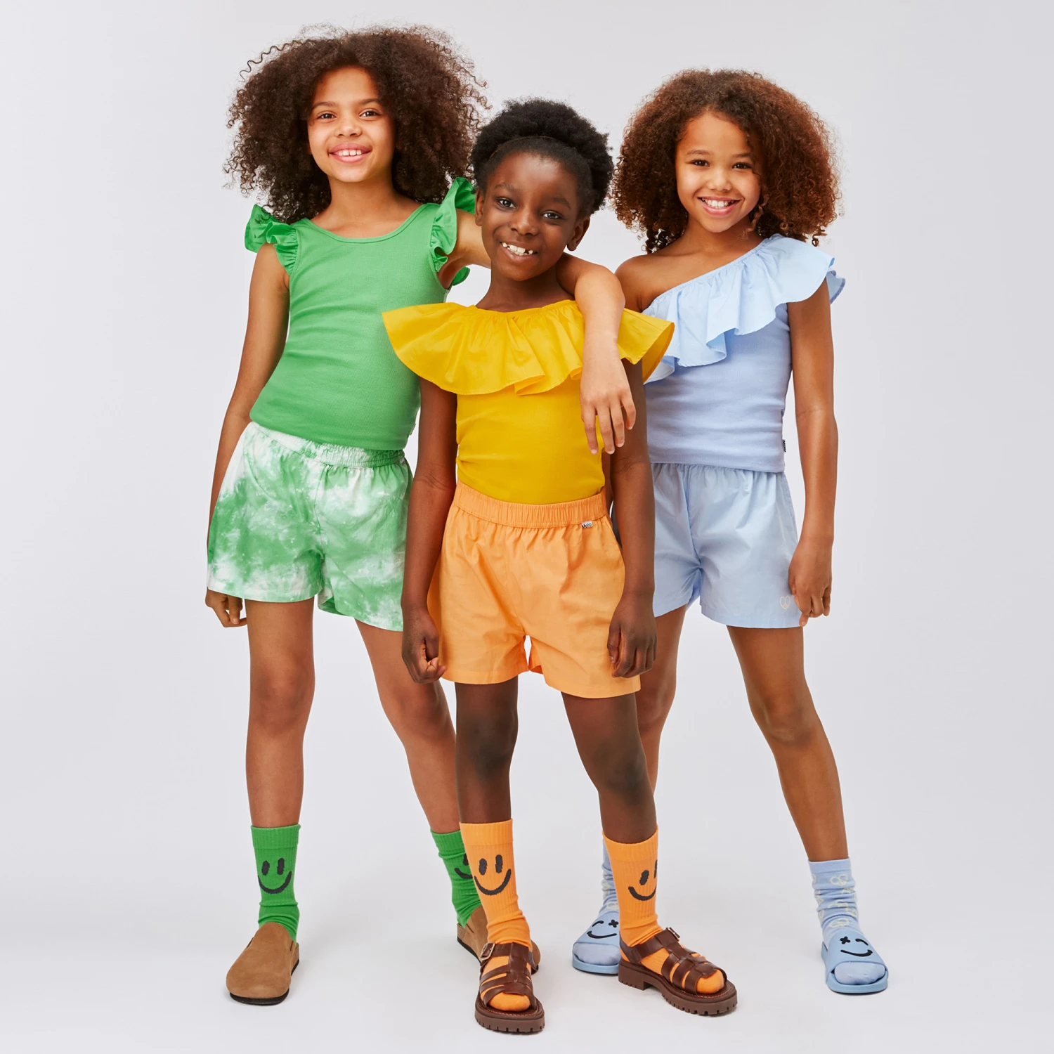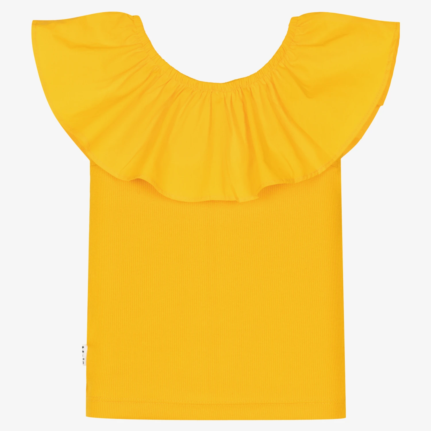 Sunny yellow T-shirt for girls by Danish brand Molo, made in soft ribbed organic cotton jersey. The gorgeous ruffle neckline adds a feminine touch to this simple style, detailed with a tiny logo tab sewn onto the side seam.