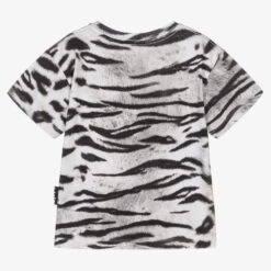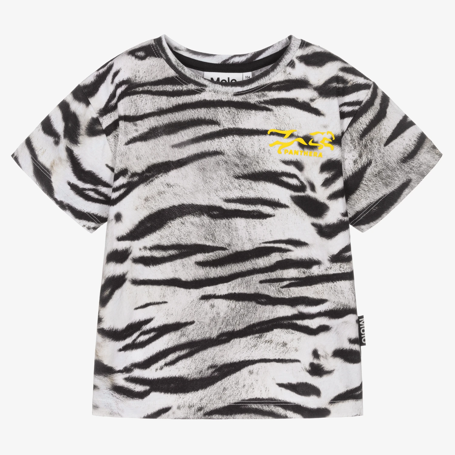 White and black T-shirt for girls and boys by Molo, made in soft organic cotton jersey. It has a lovely tiger print and a raised, yellow Panthera logo printed on the chest.