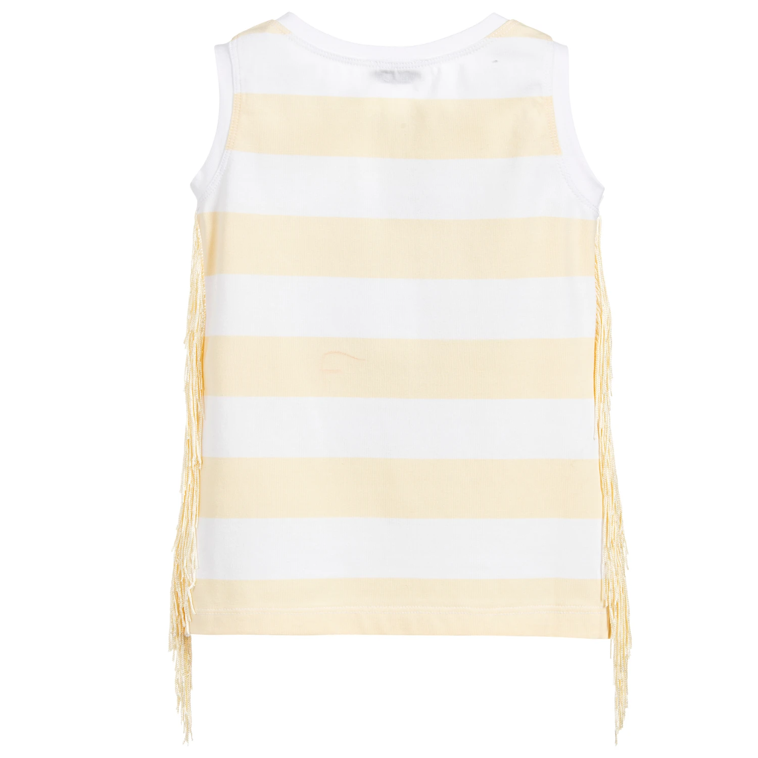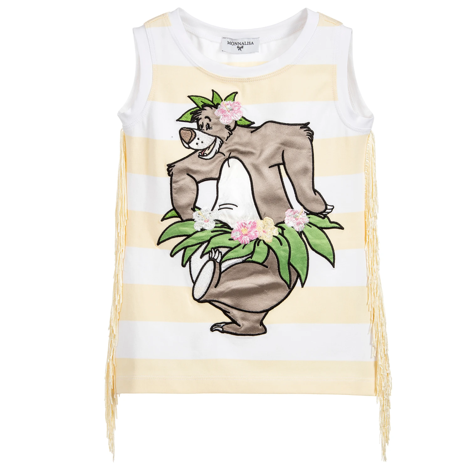 With a large appliqué of The Jungle Book’s ‘Baloo’ on the front, this ivory and yellow striped T-shirt by Monnalisa Bimba is ideal for Disney fans. It is made in a soft and stretchy cotton jersey, and has fun yellow tassels on the sides.