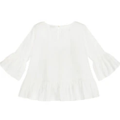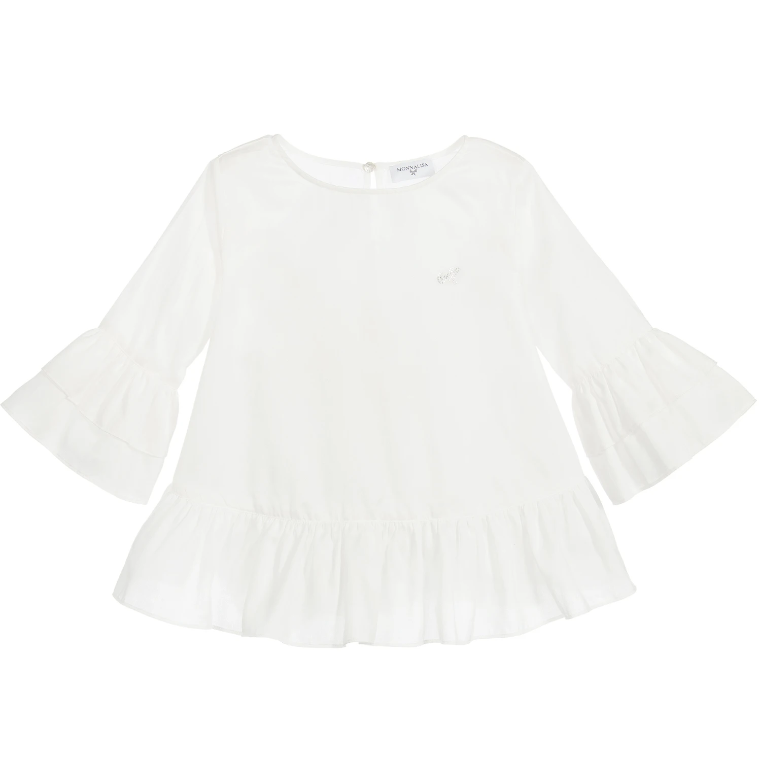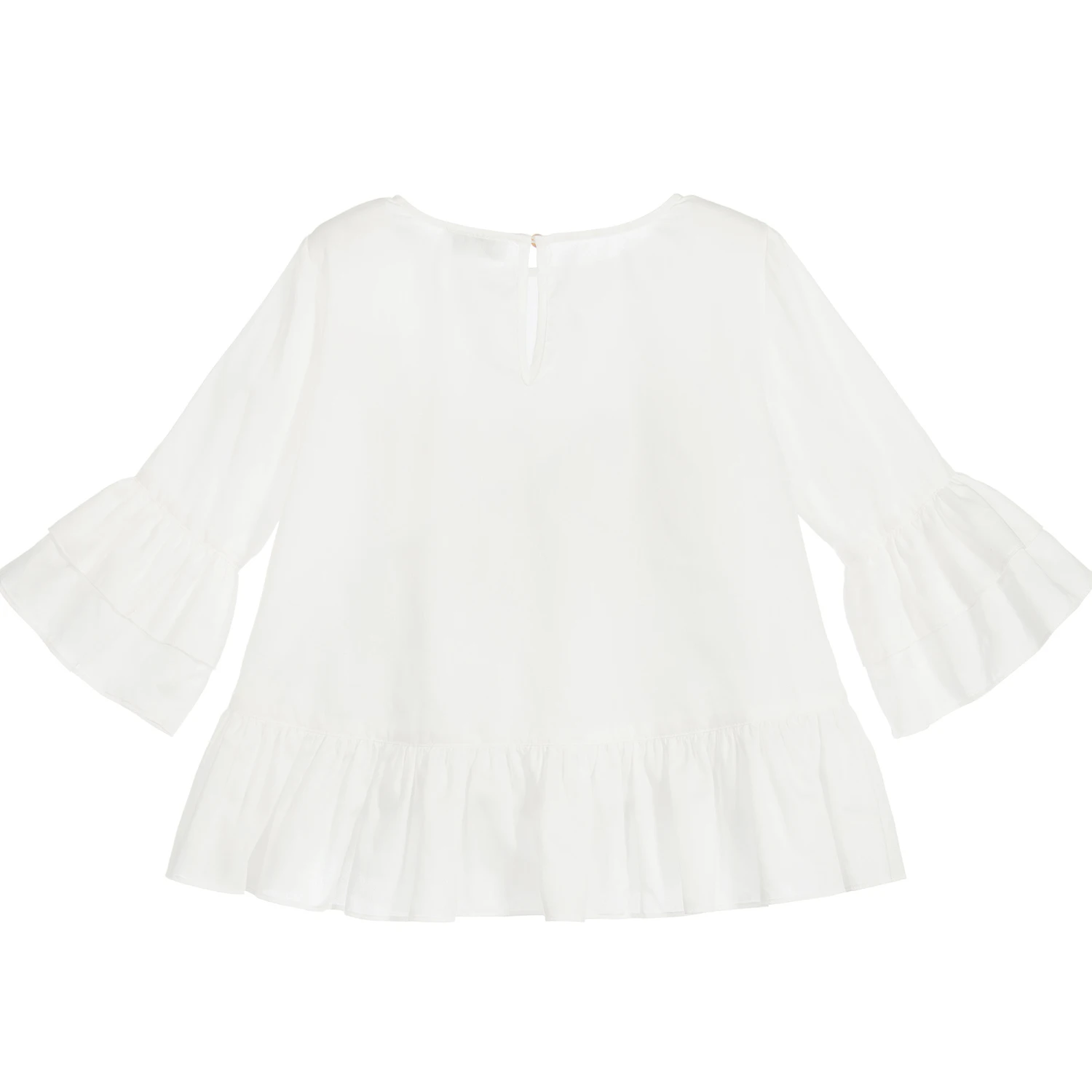 Lightweight and pretty, this loose tunic top by Monnalisa Bimba is a charming piece to add to a special girl’s wardrobe. Made in soft white cotton, it has ruffled sleeves and peplum hem to enhance its feminine and floaty feel.