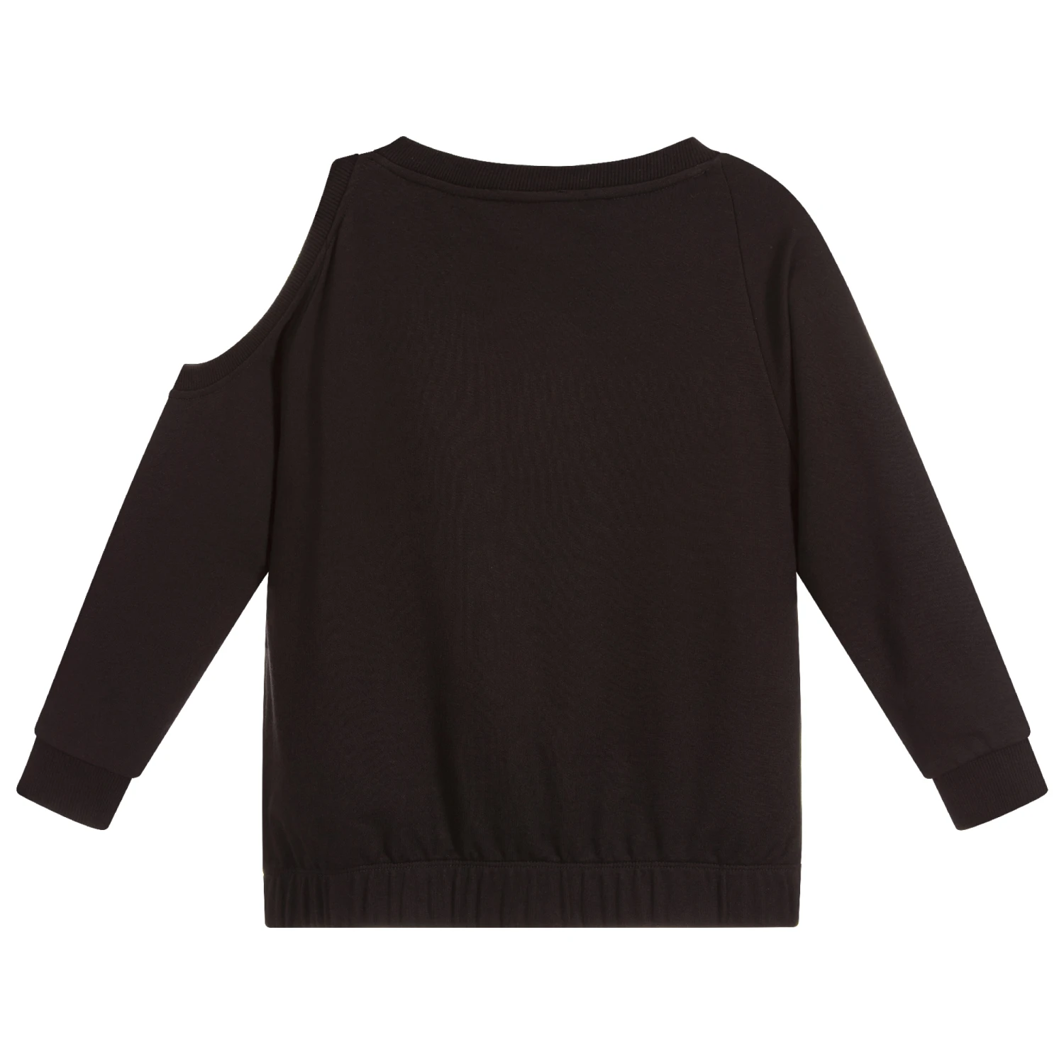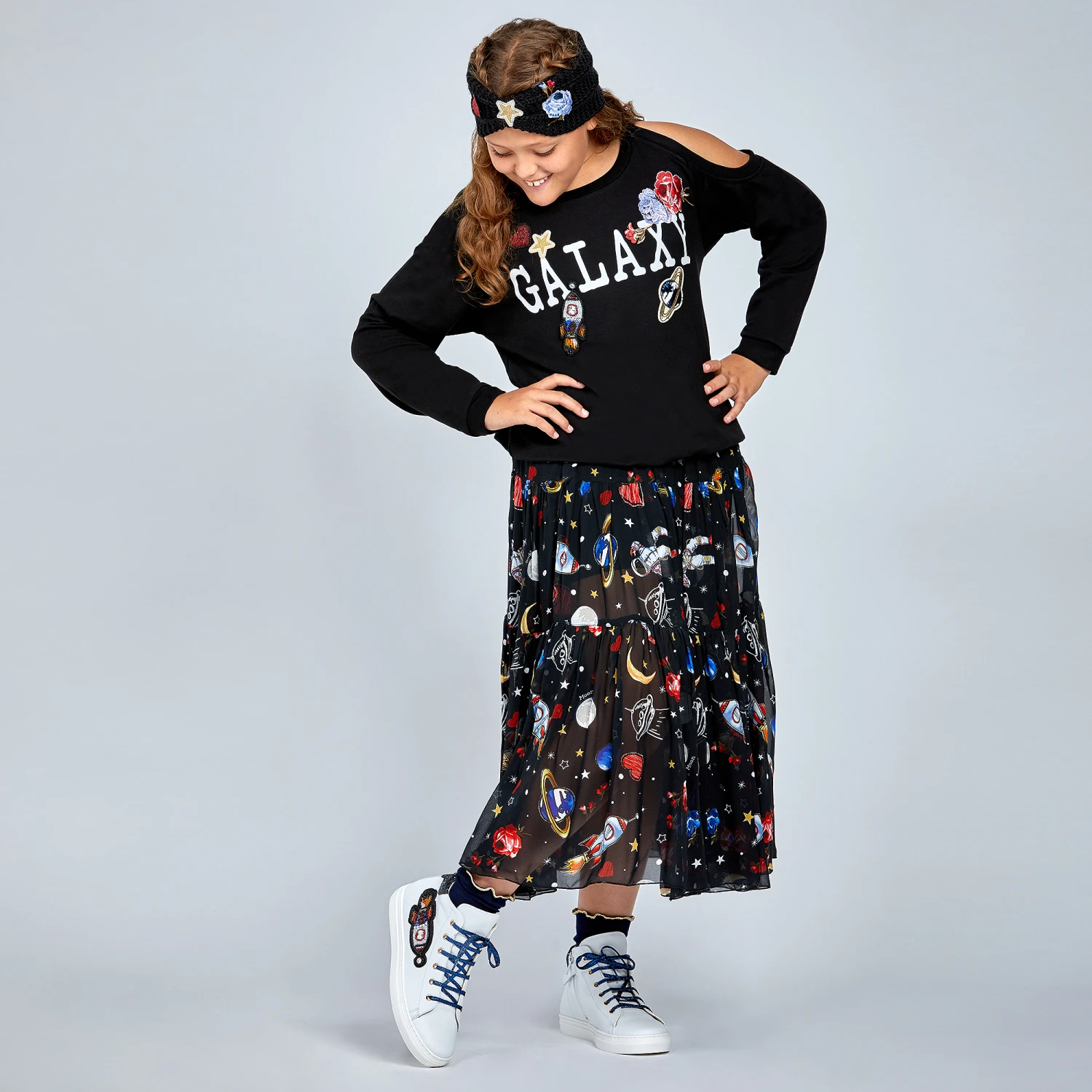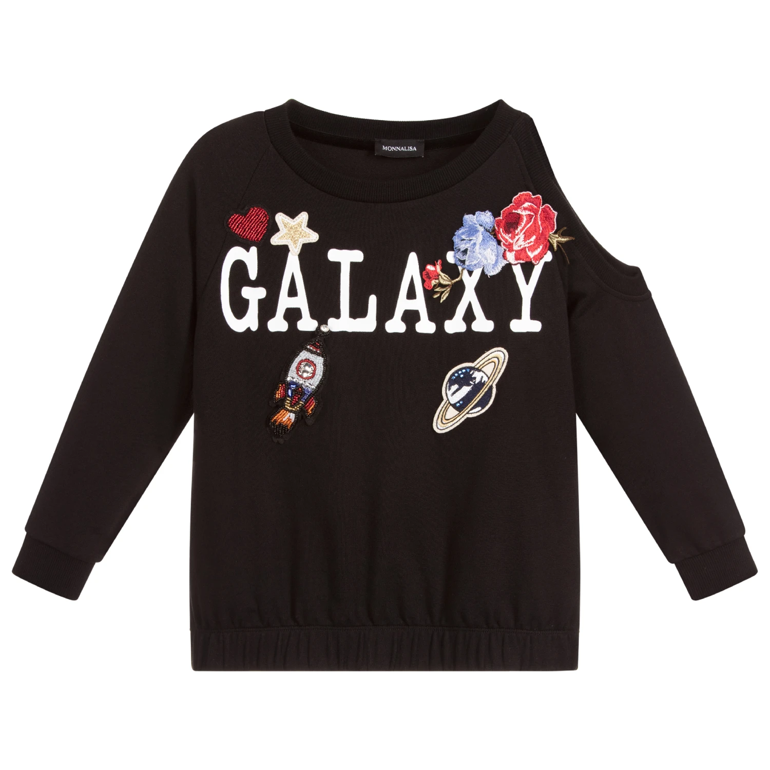 Girls black sweatshirt by Monnalisa with a beaded space ship and planet and signature rose embroidery. It is made in a soft viscose jersey with stretchy ribbed trims and a cut-out shoulder.